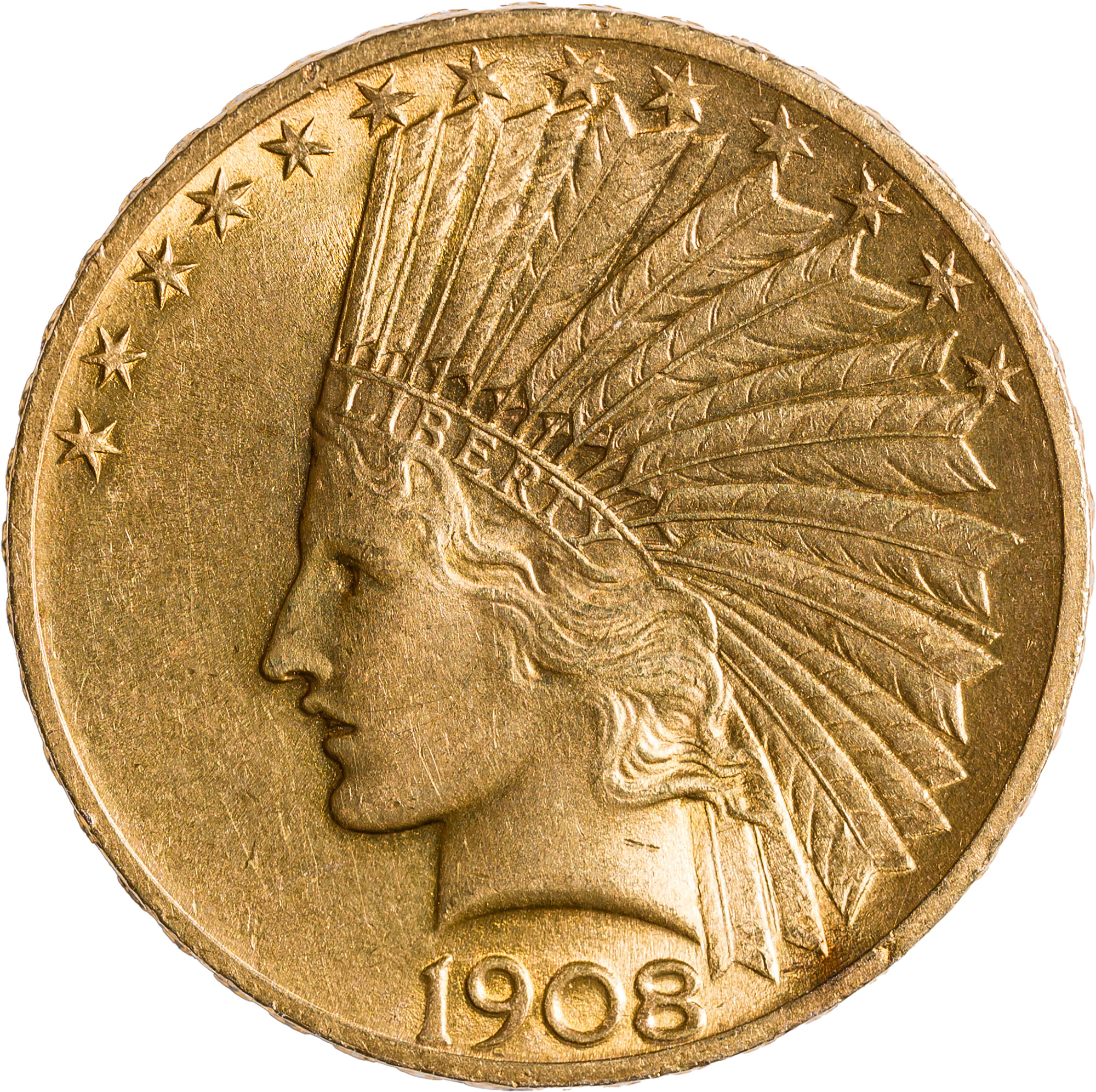 MS-62 1908 With Motto $10 Gold Indian