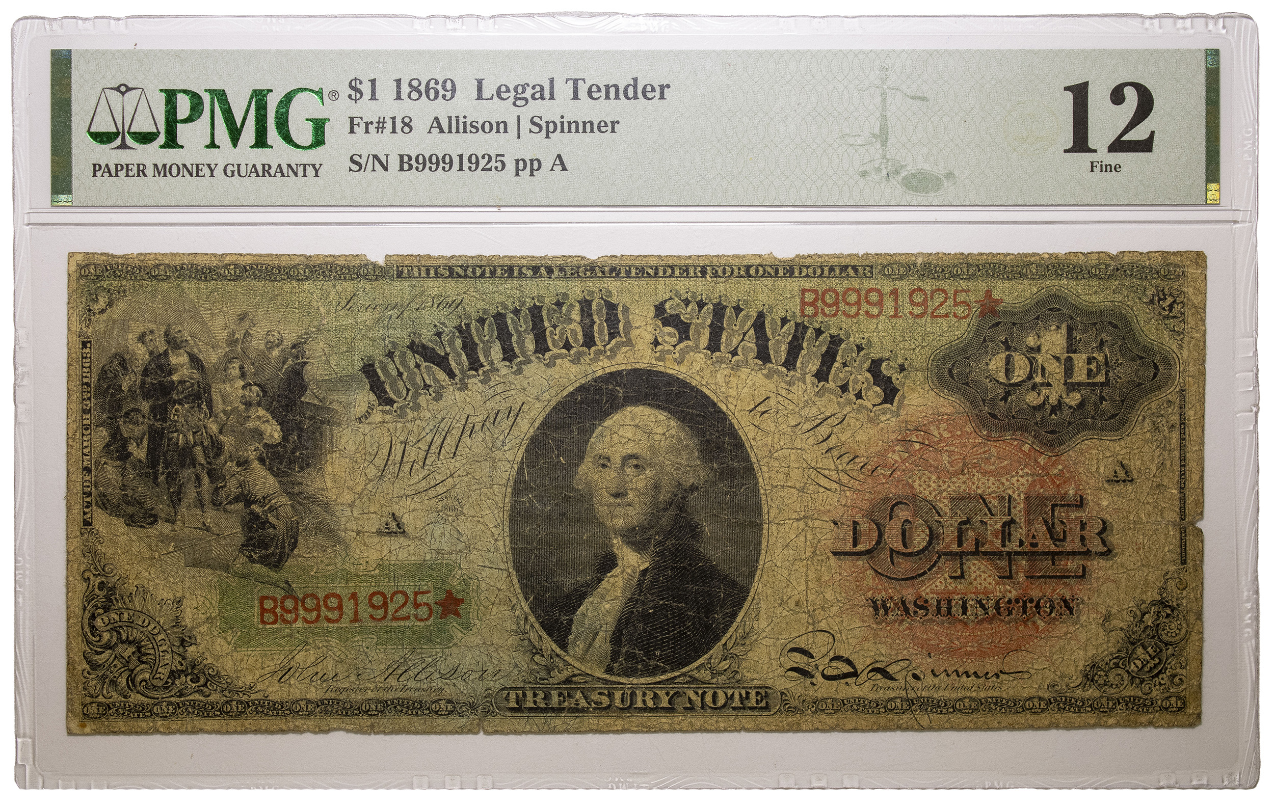 PMG F-12 1869 $1 Rainbow Note