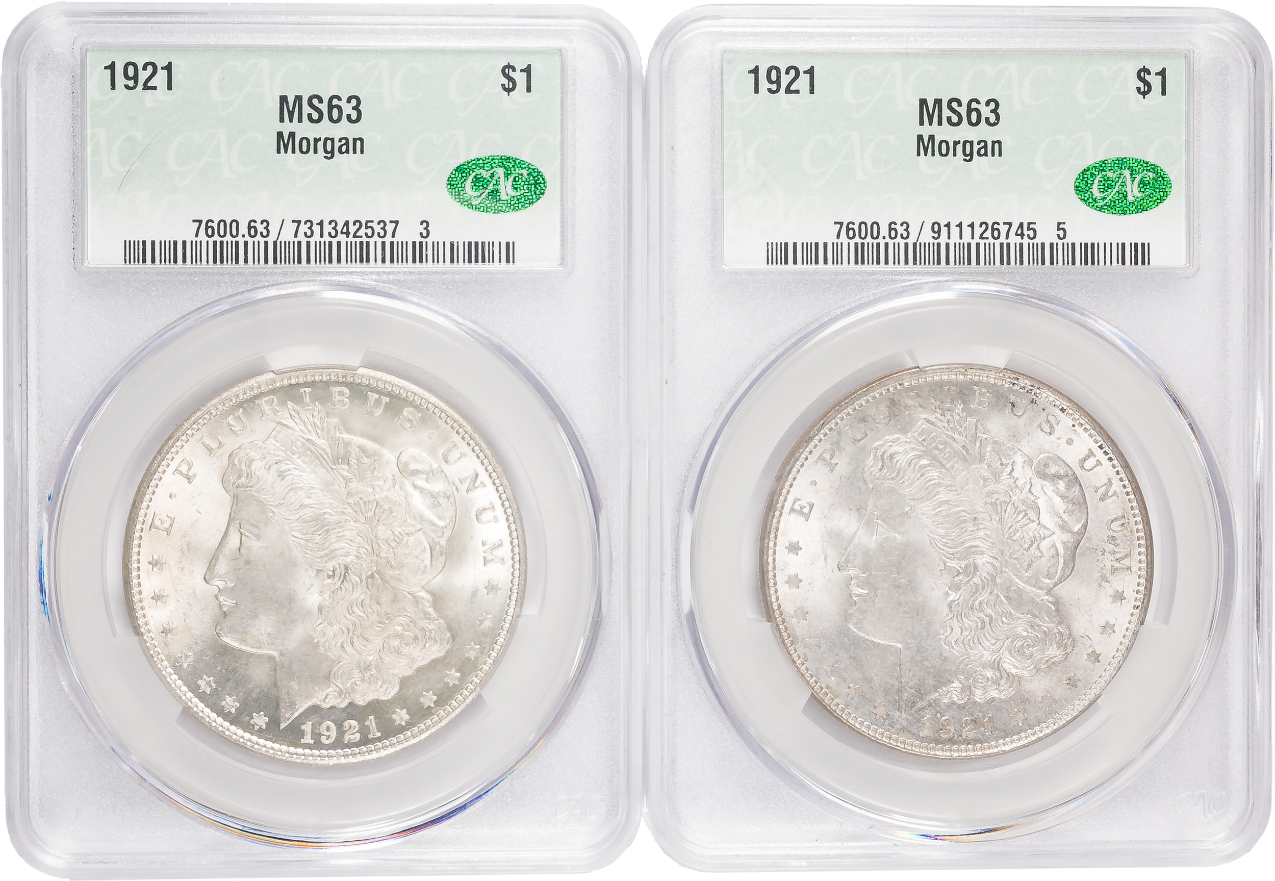 Pair Of CACG MS-63 1921 Morgan Dollars