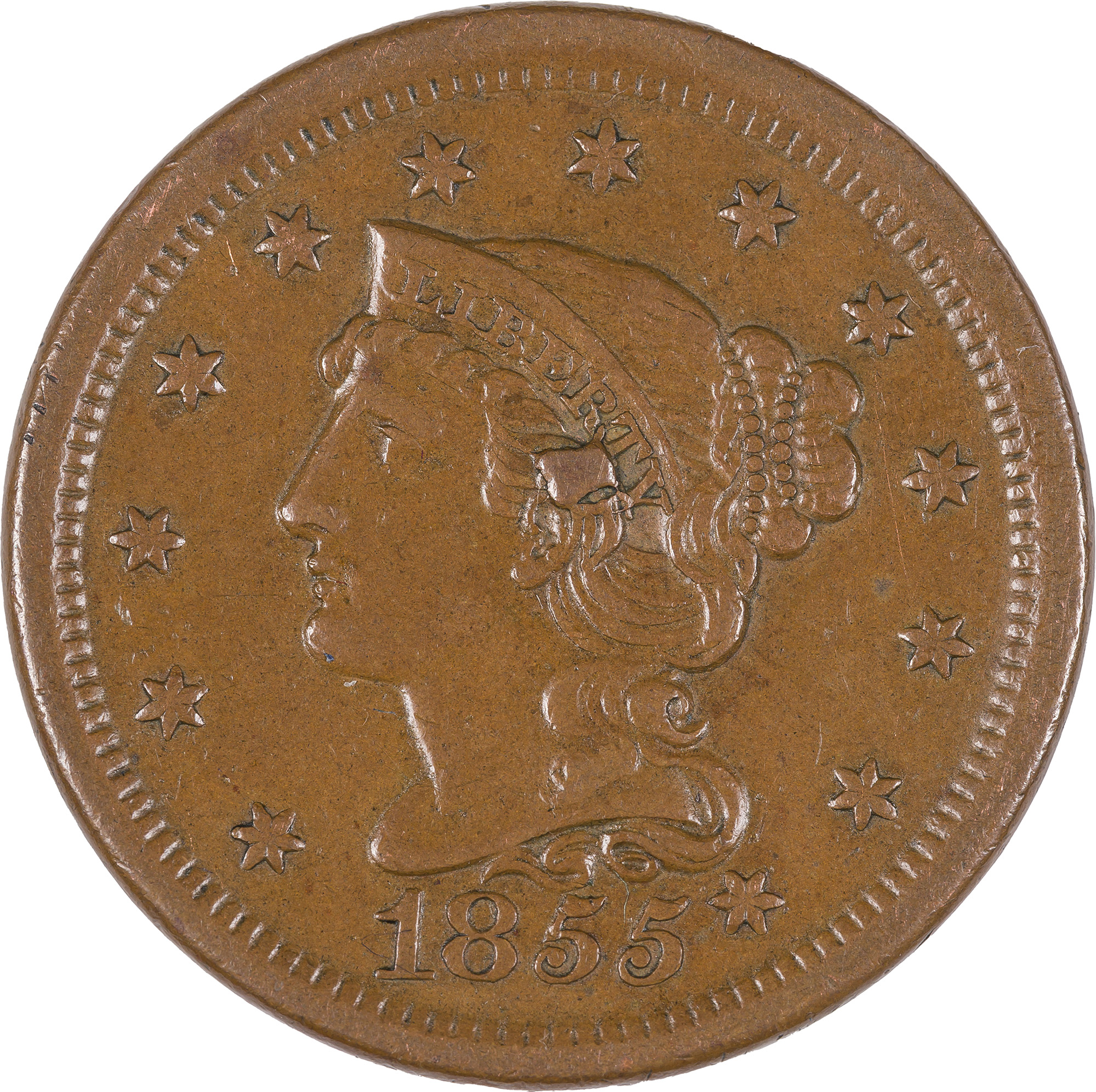 AU-50 1855 Knob On Ear Large Cent