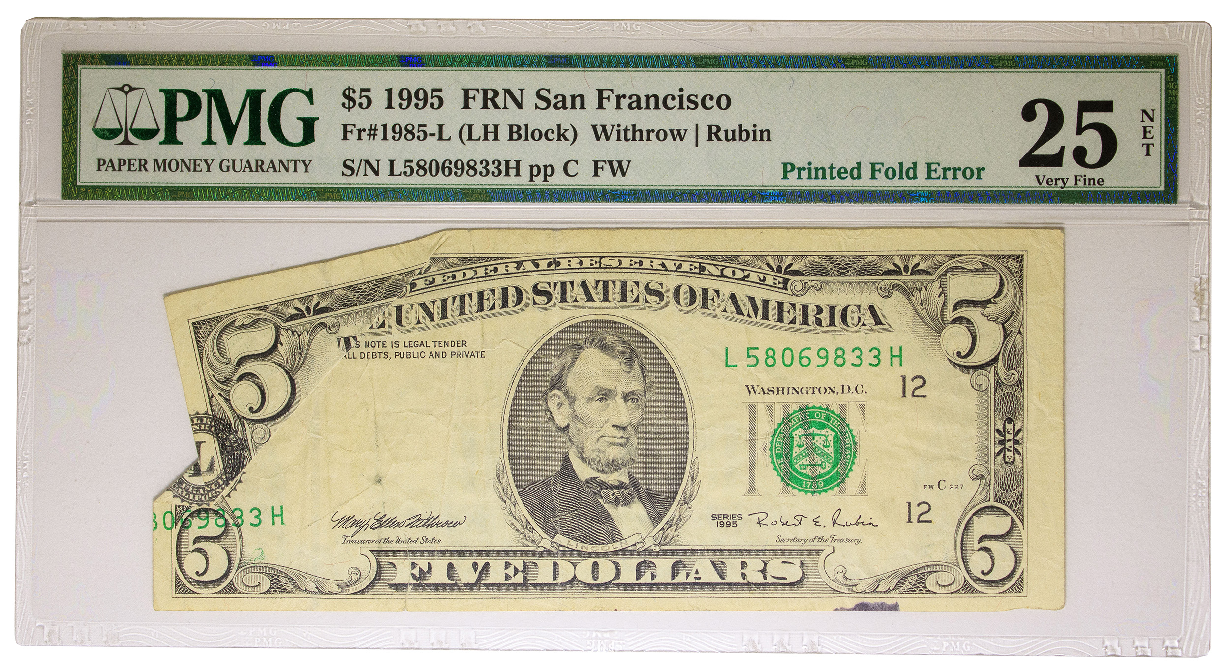 PMG VF-25 Net 1995 $5 Printed Fold Error