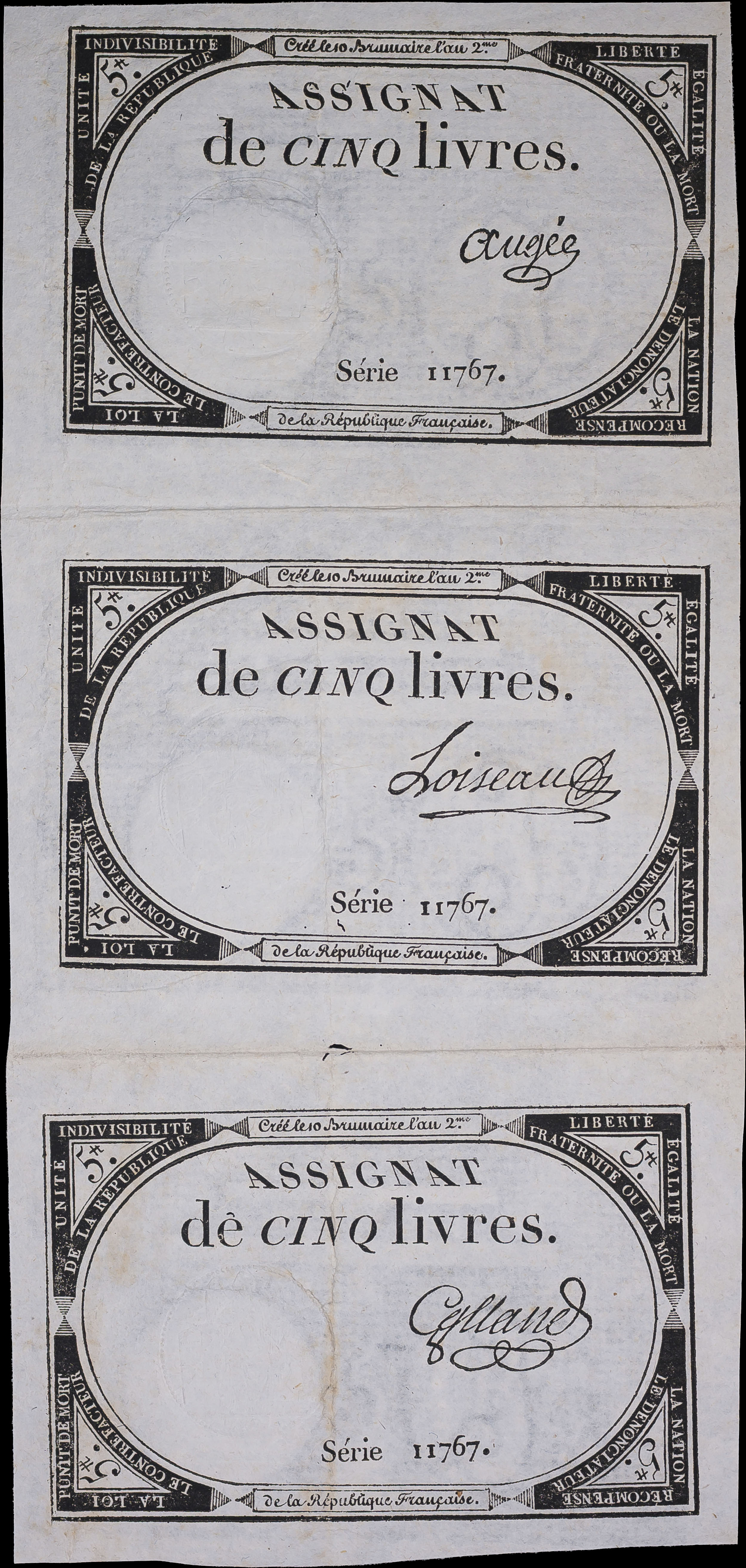France. VF Uncut Sheet 1793 5 Livres Notes