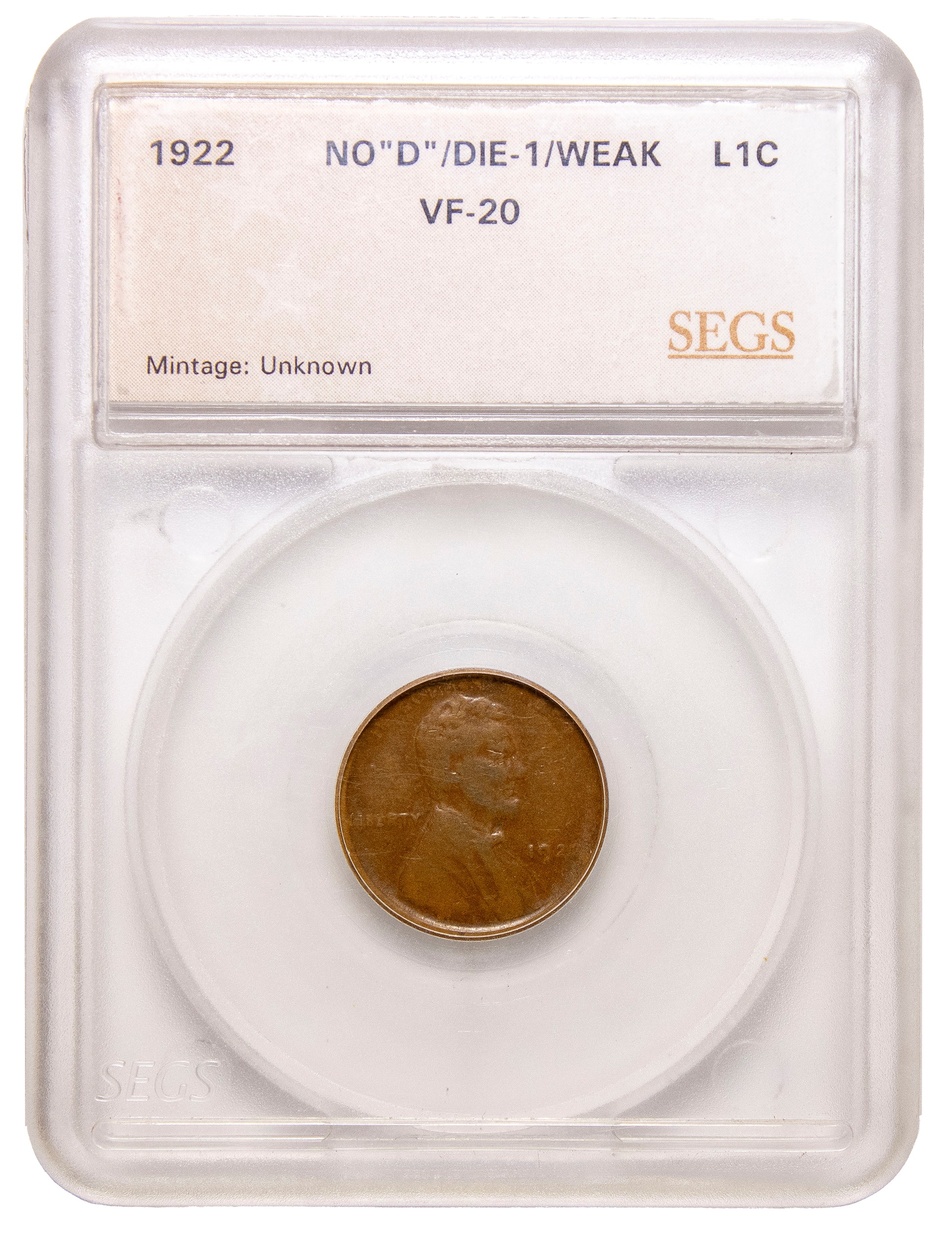 SEGS VF-20 1922 No D Weak Reverse Lincoln Cent