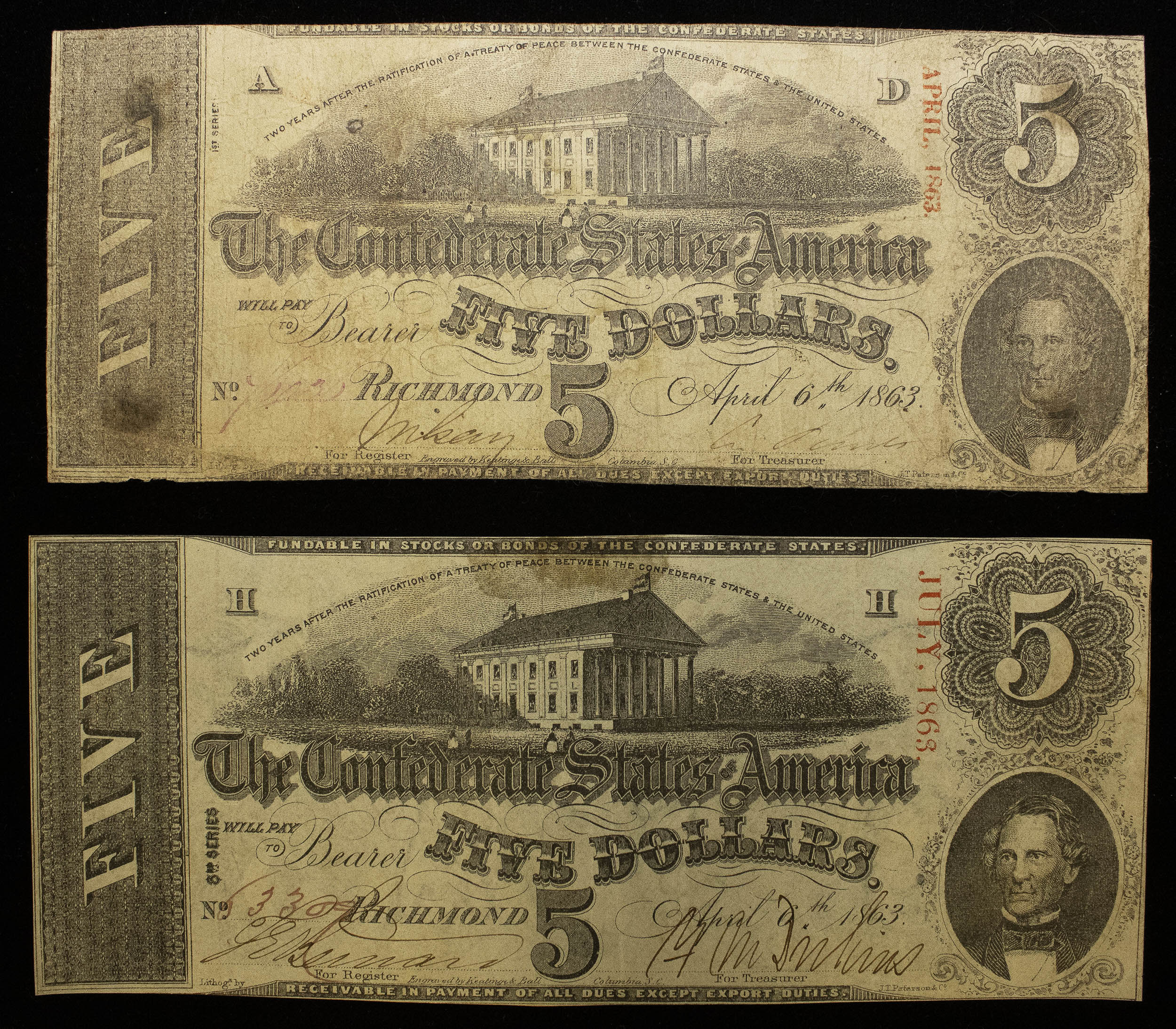 Confederate. $5 Note Pair W/Rare A/D Plate