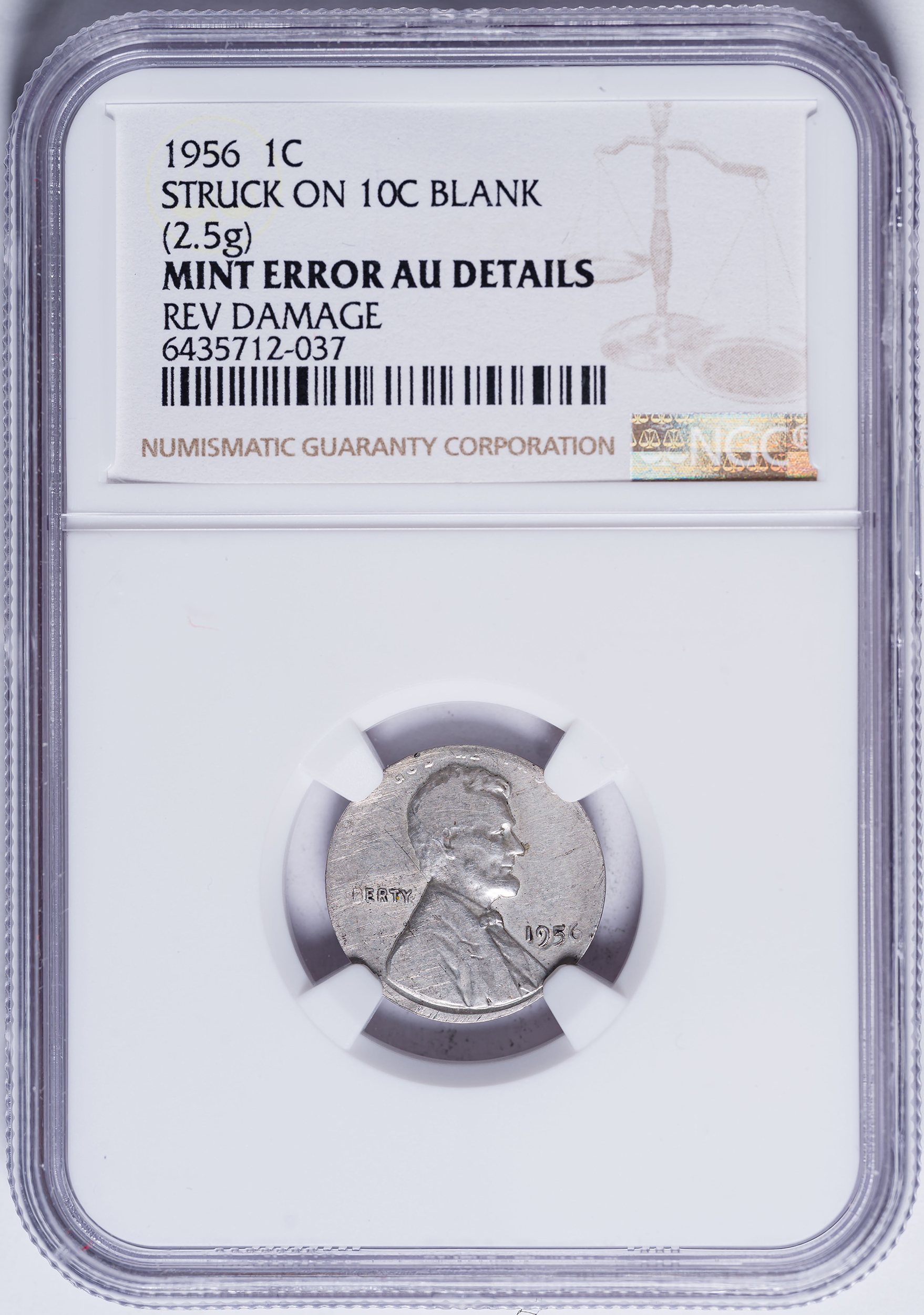 NGC AU Details 1956 Cent Struck On A Dime Blank