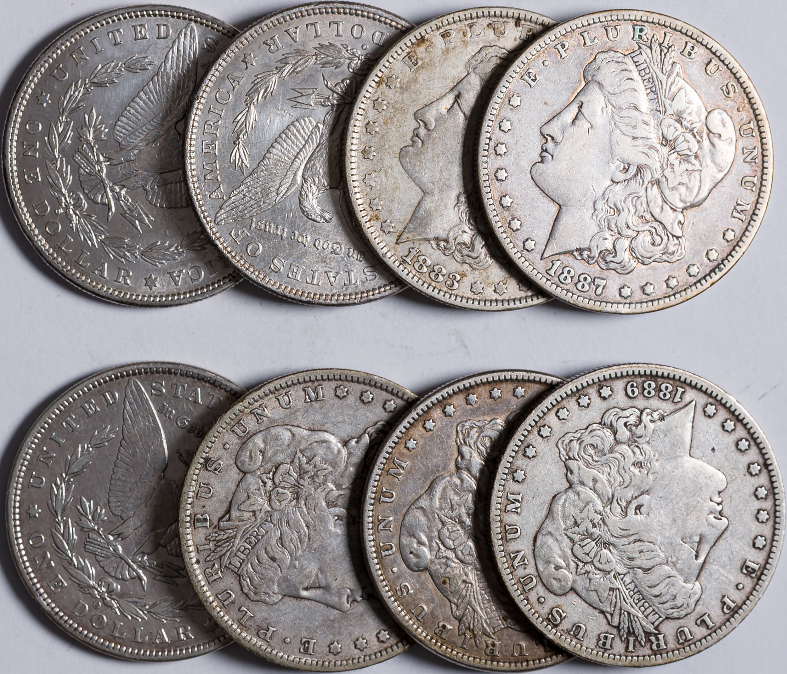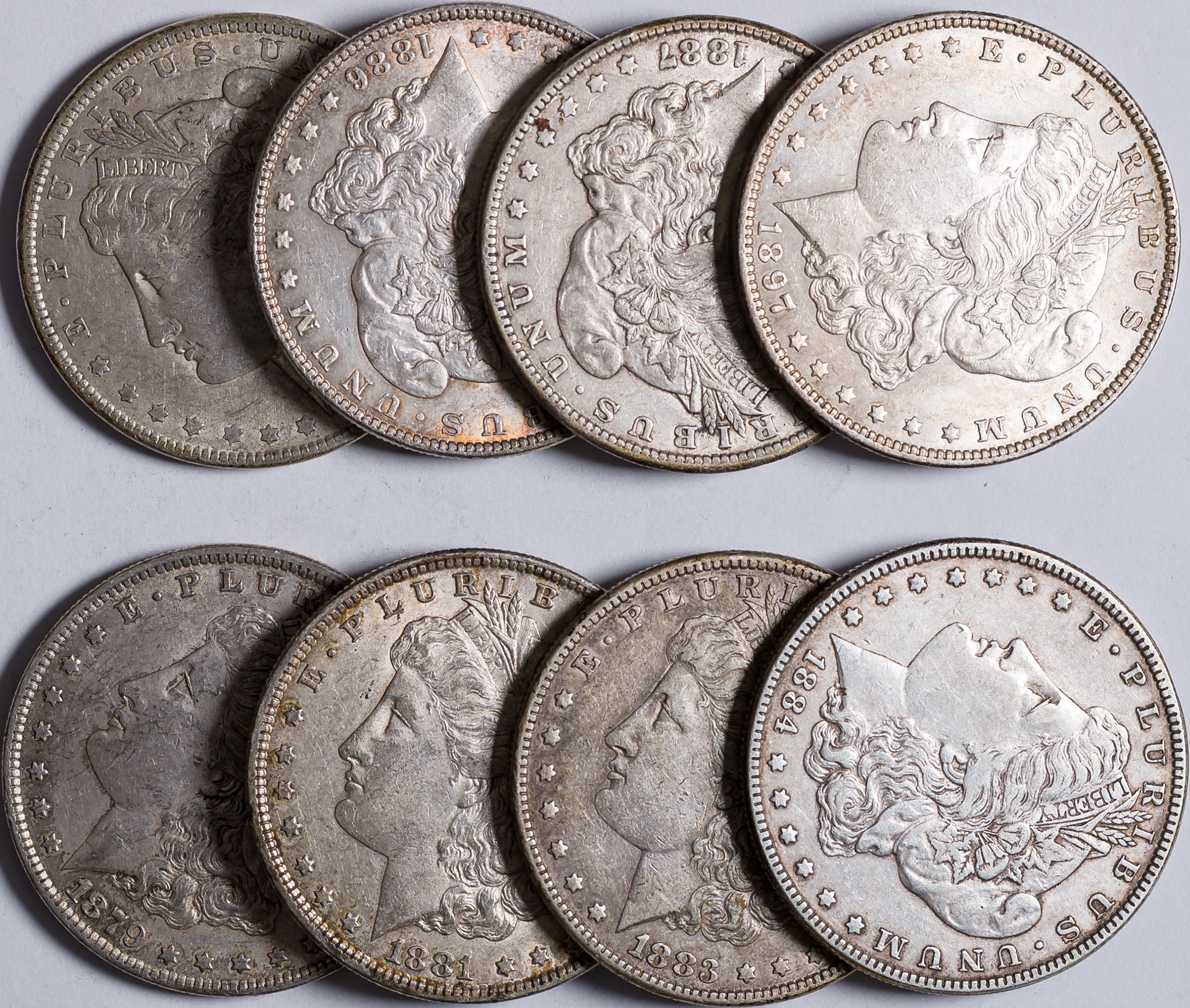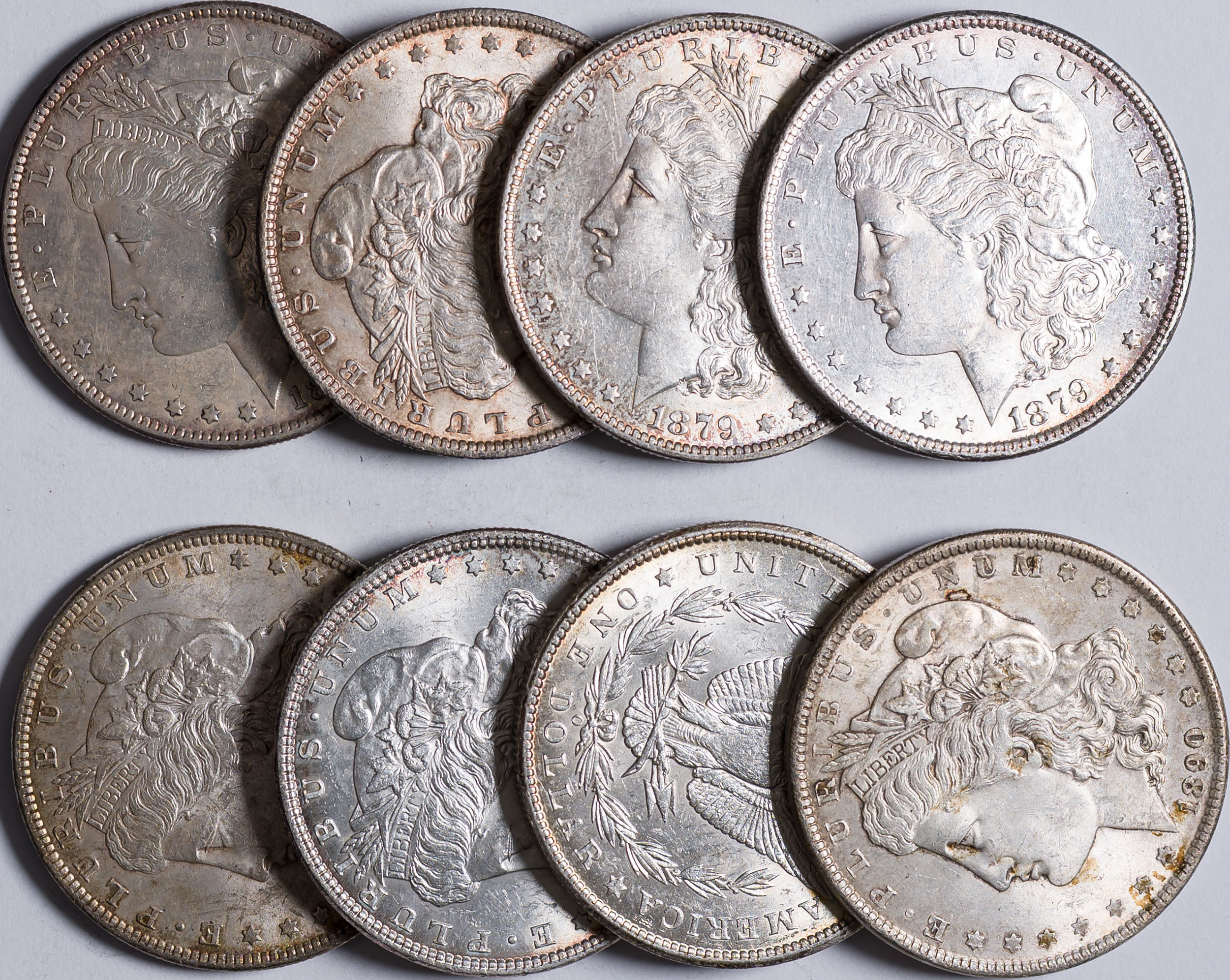 Eight Different MS-60 to MS-62 Morgan Dollars
