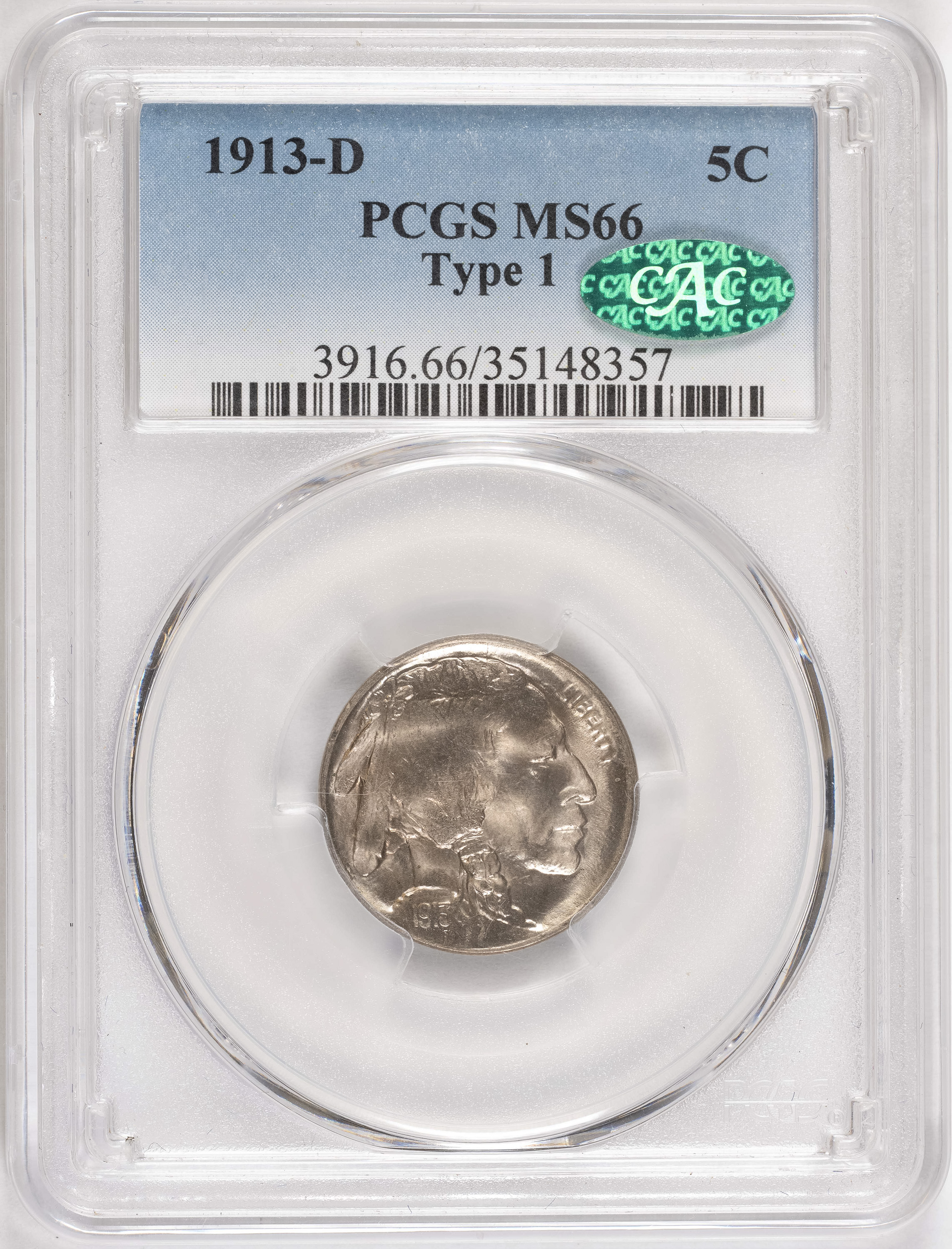 PCGS MS-66 CAC 1913-D TI Buffalo Nickel