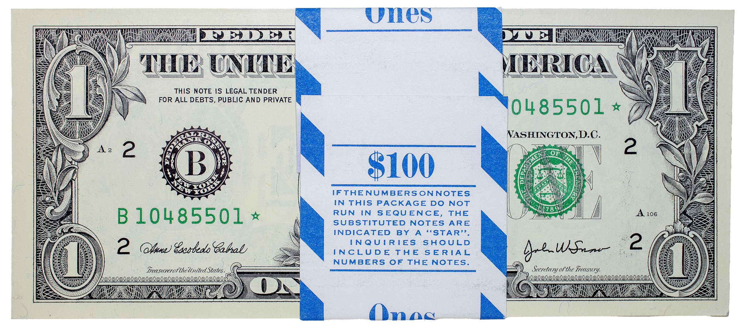 Bank Wrapped Stack of 100 2003A $1 Star Notes