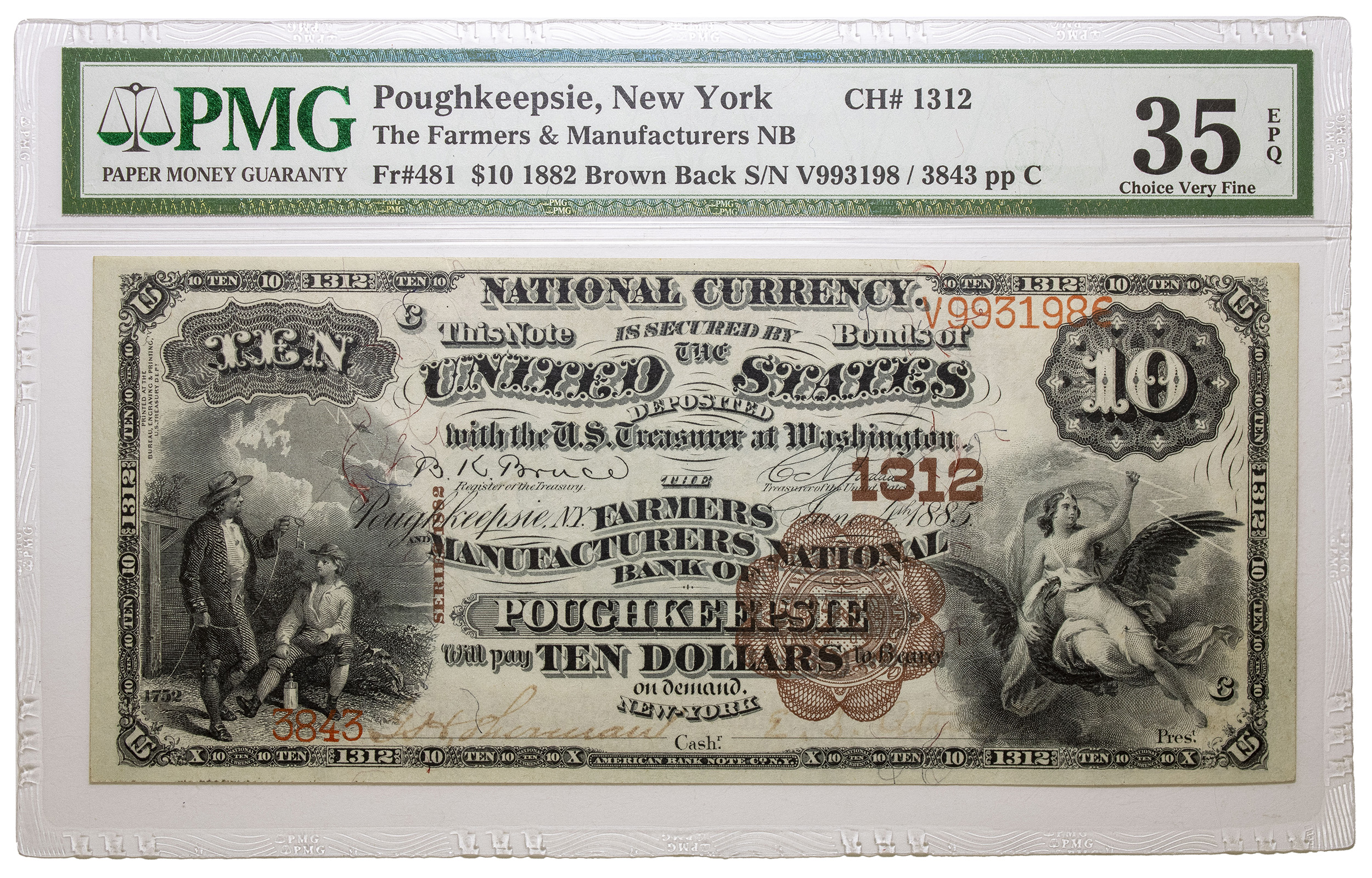 PMG VF-35 $10 1882 Brown Back Poughkeepsie NY