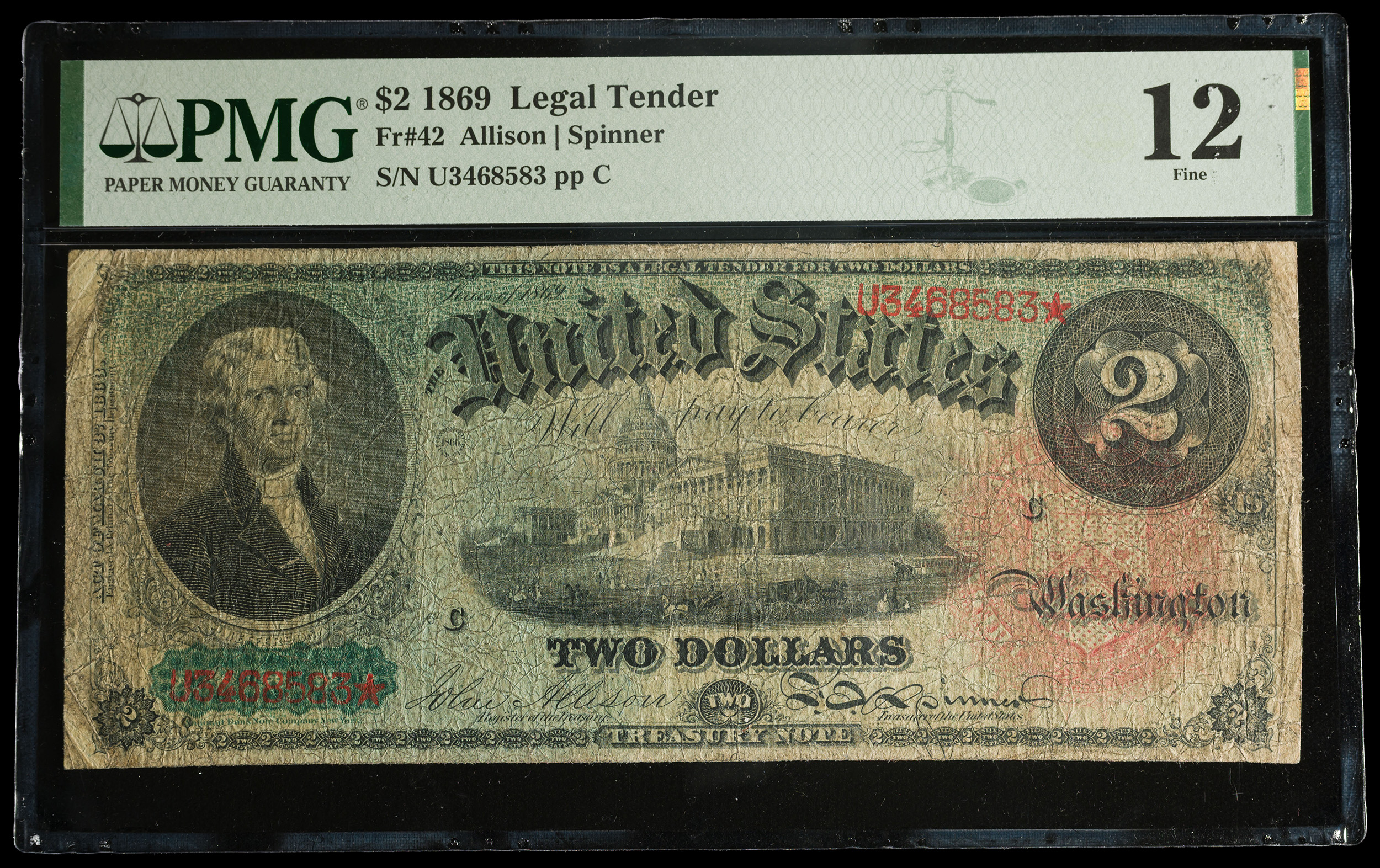 PMG Fine-12 Series 1869 Rainbow $2 Treasury Note