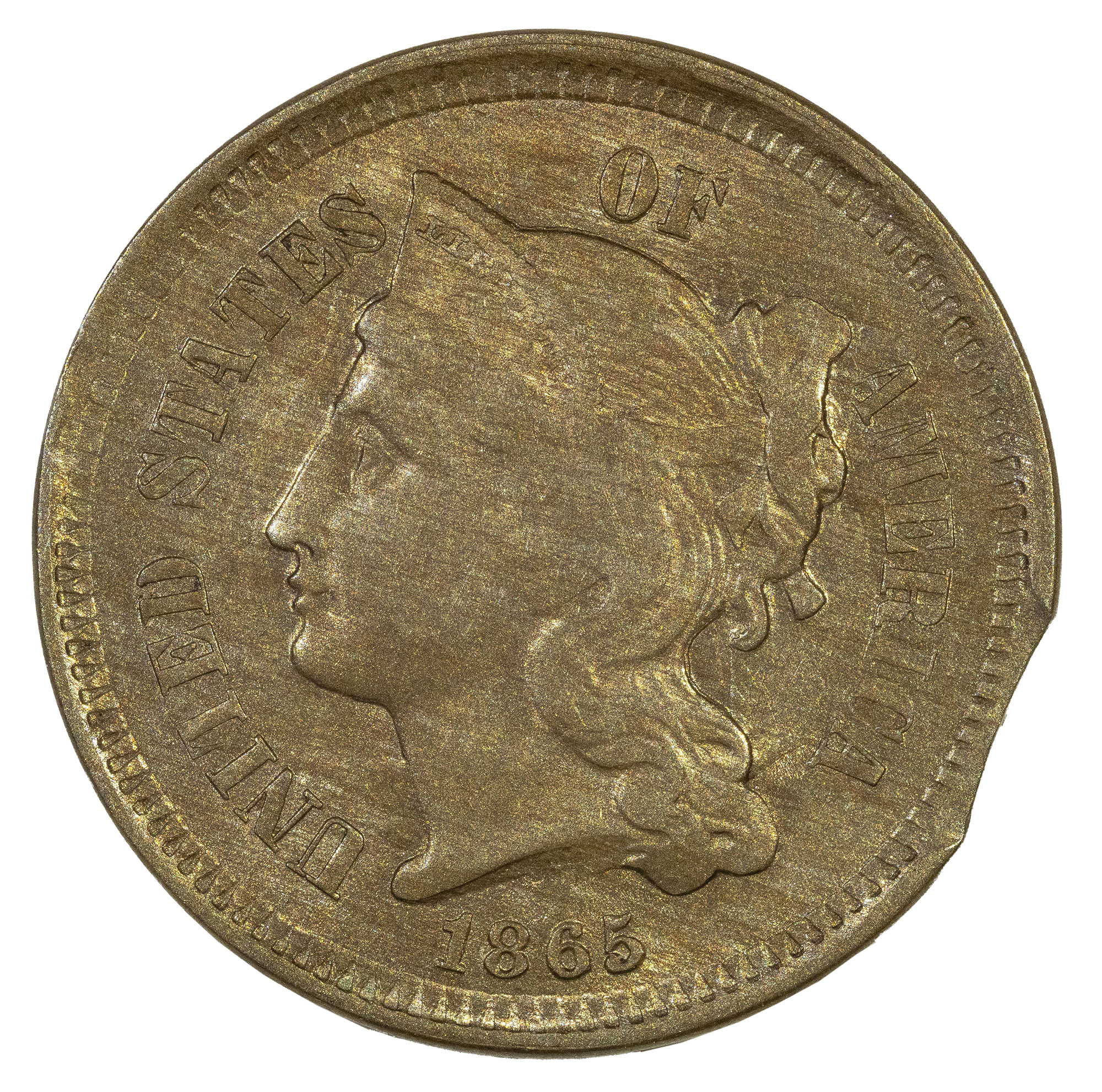 AU-50 Planchet Clip Error 1865 Nickel Three-Cents