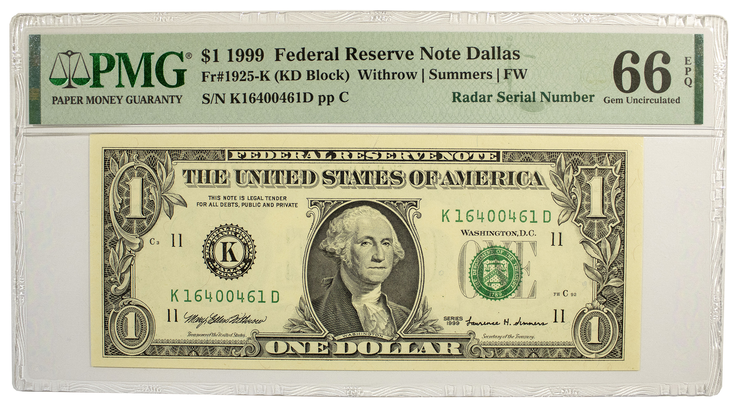 PMG Gem-66 1999 Radar Serial Number $1 Note