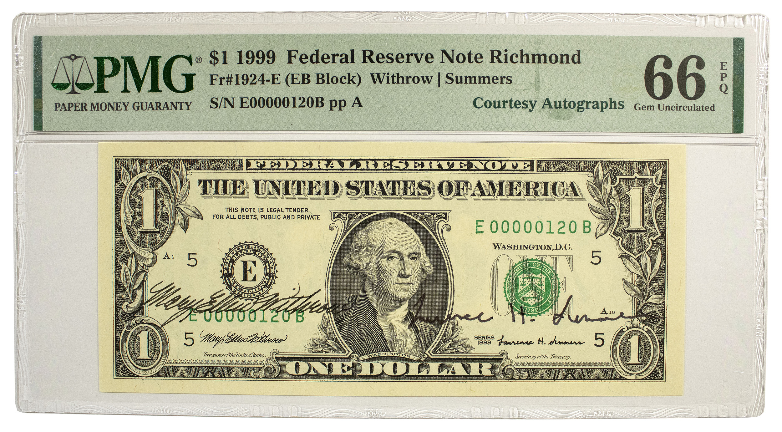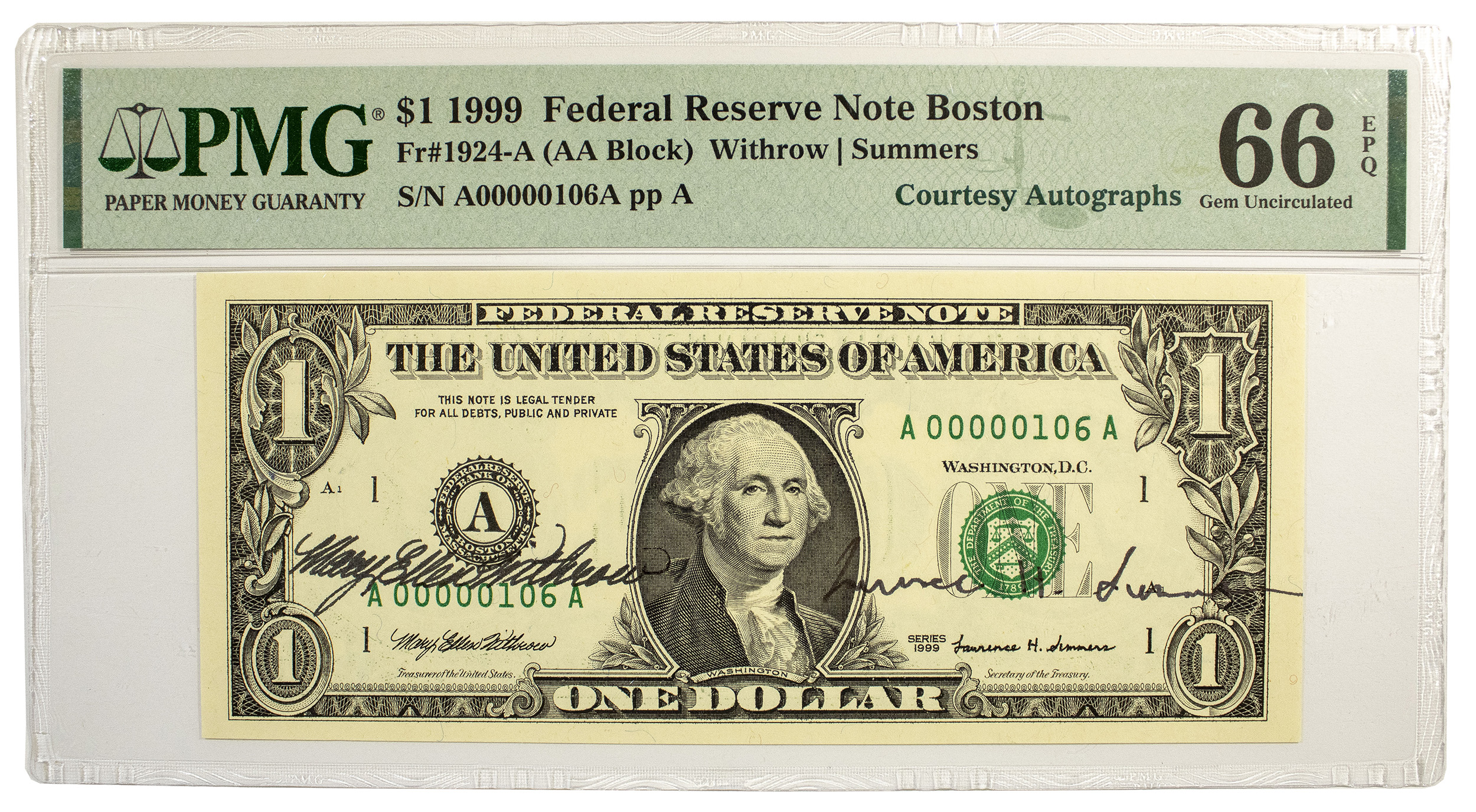 PMG Gem-66 1999 Courtesy Signed Twice $1