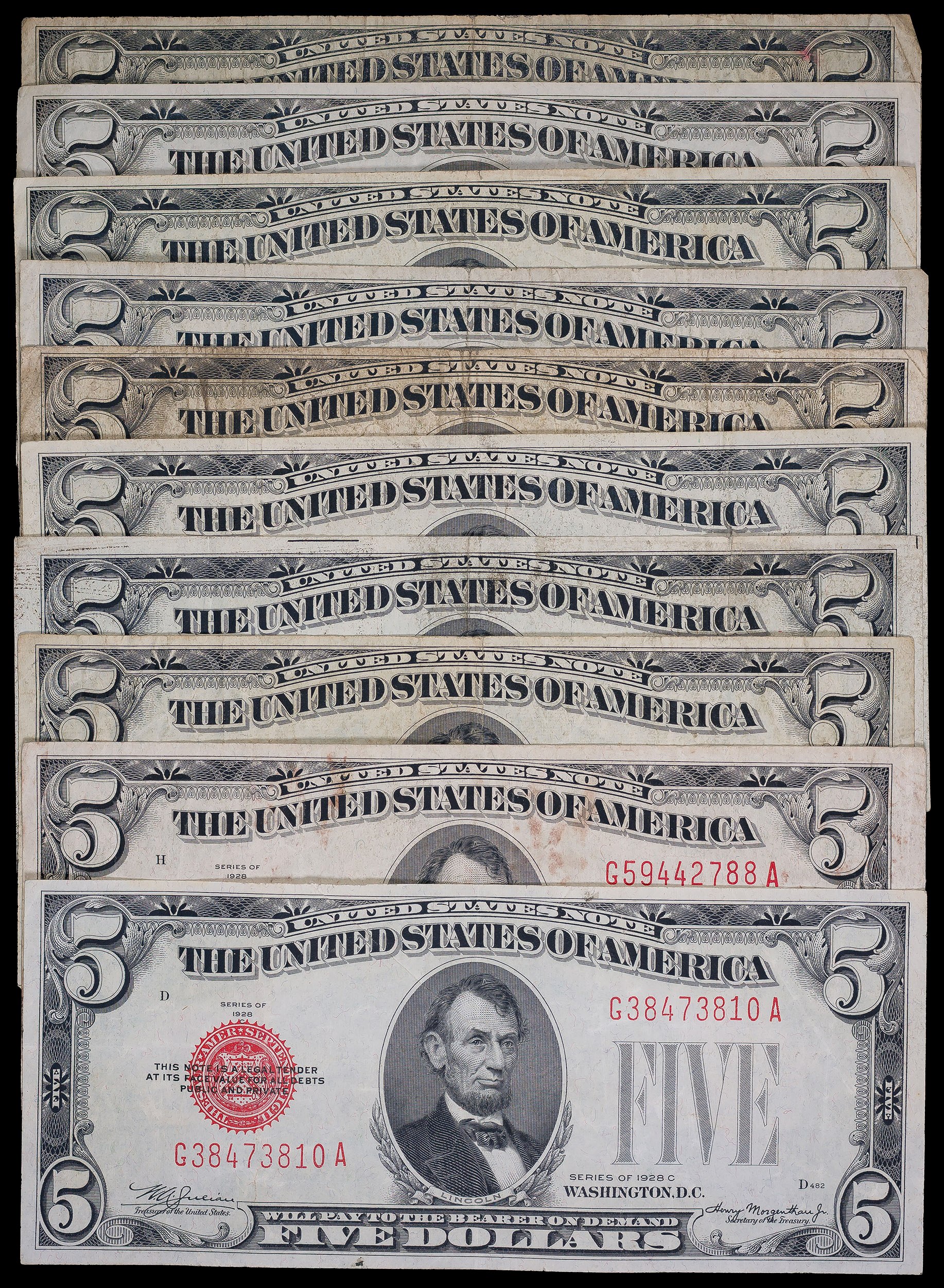 10 Pieces Mixed 1928 $5 U.S. Notes