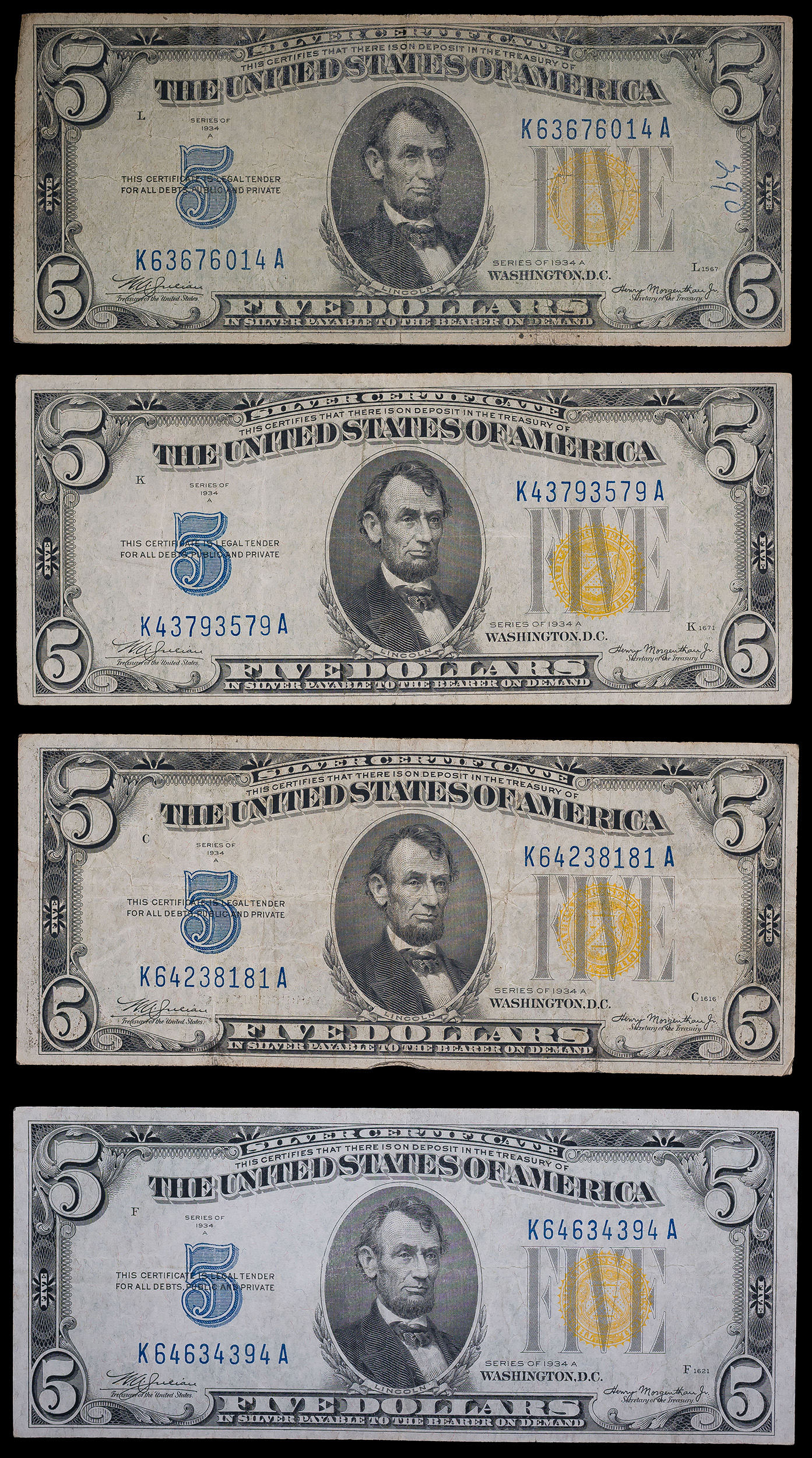 4 Pieces 1934 A $5 North Africa Silver Certs