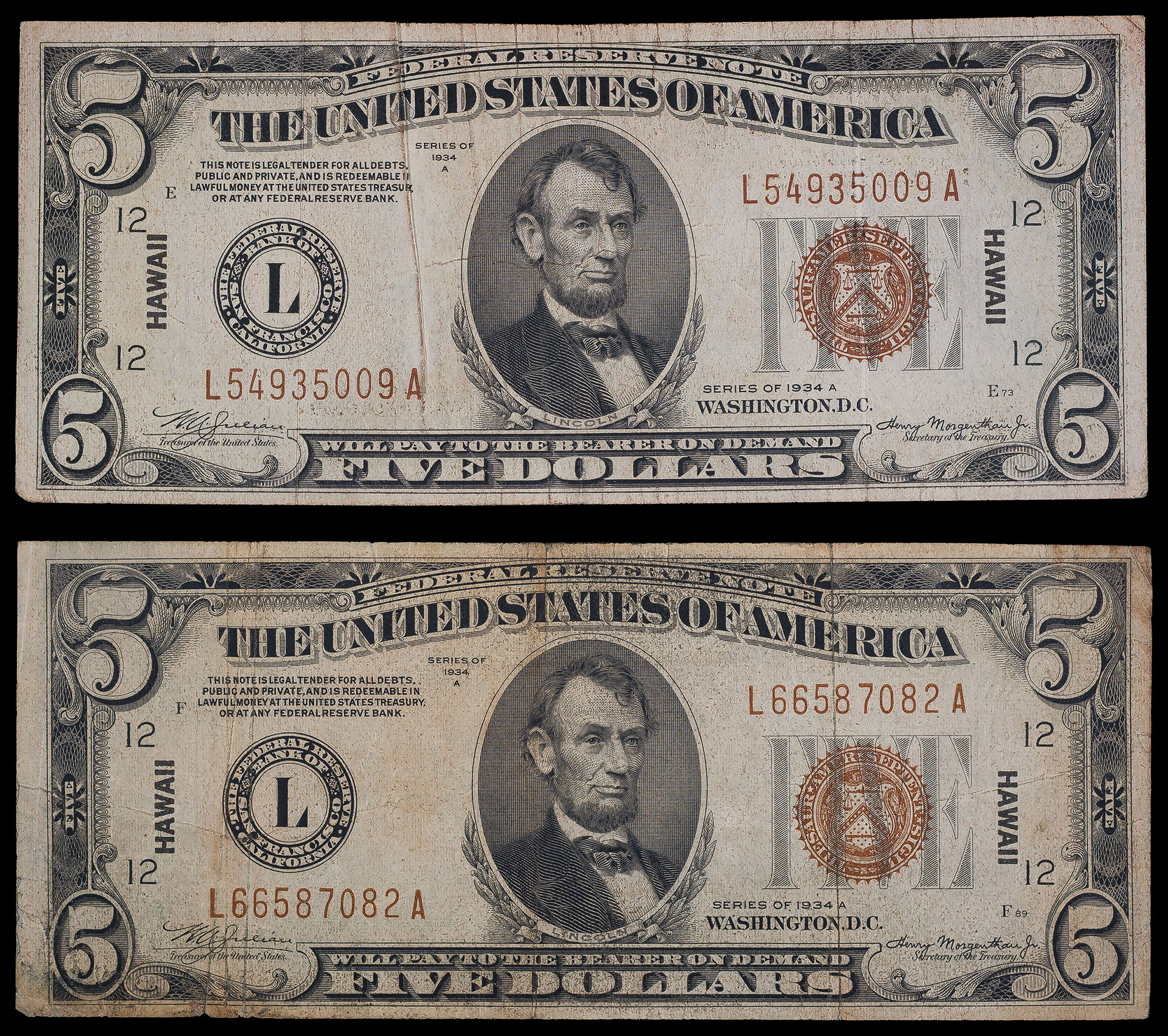 2 Pieces 1934-A Hawaii $5 FRN's