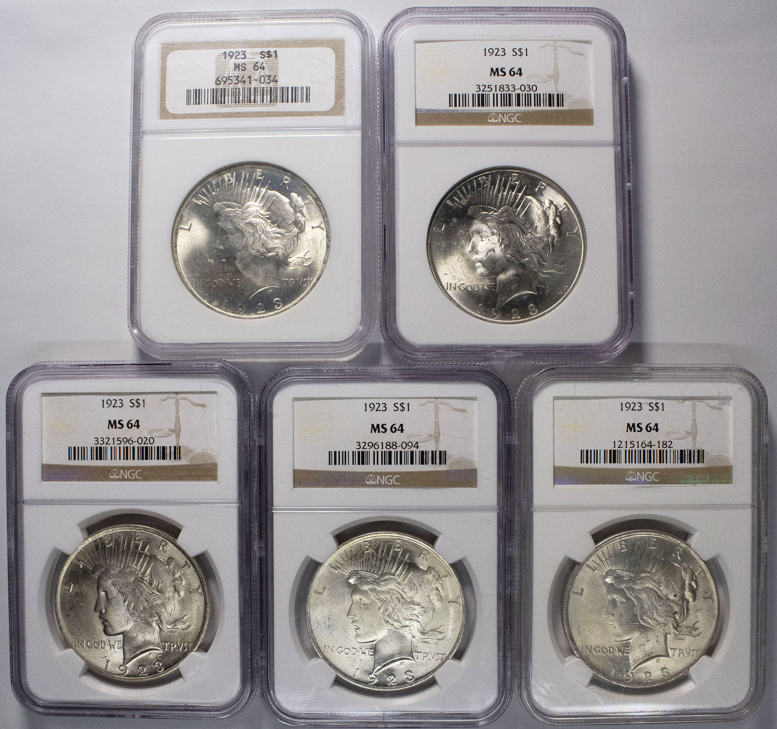 5 Pieces NGC MS-64 1923 Peace Dollars