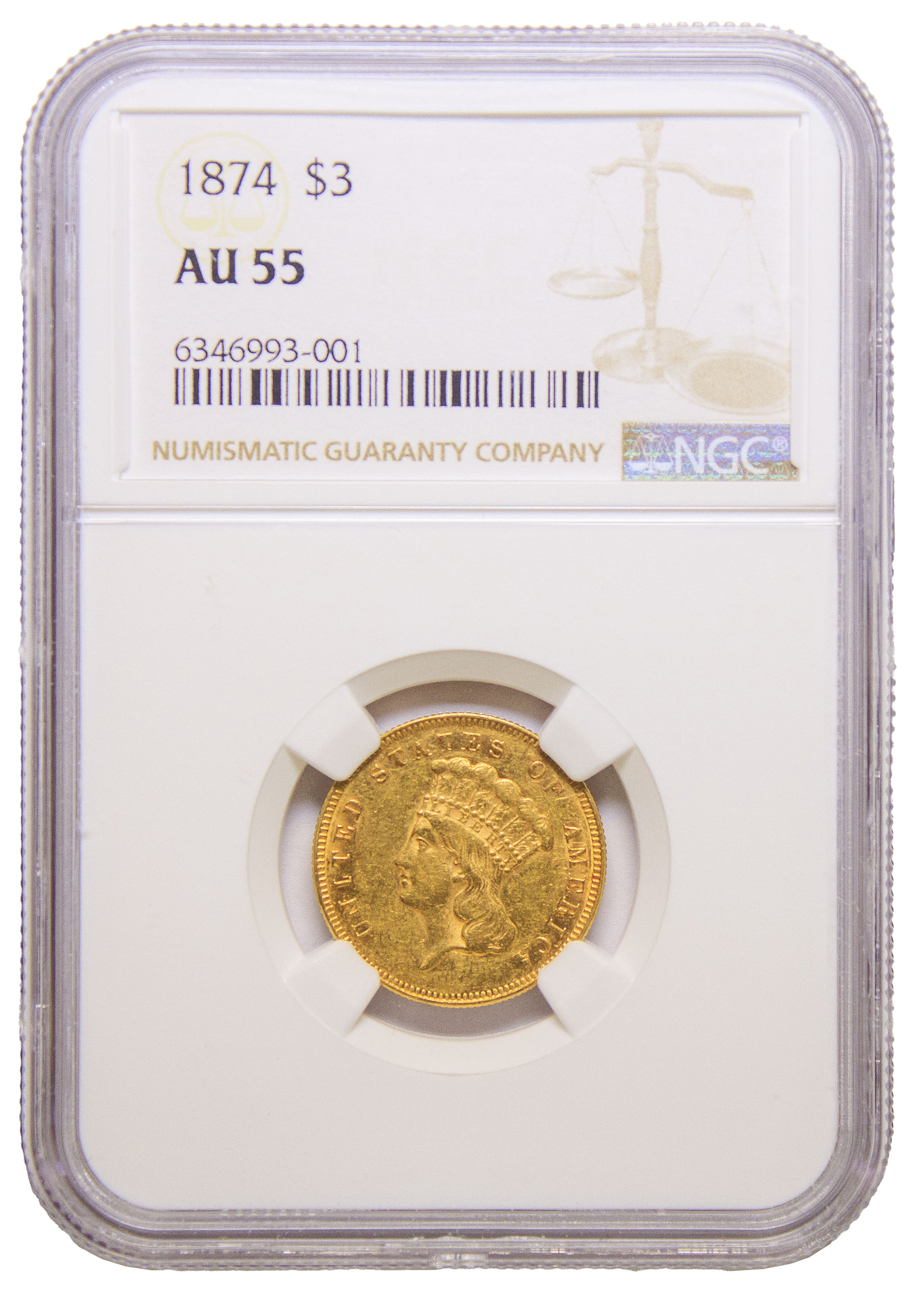 NGC AU-55 1874 Gold $3
