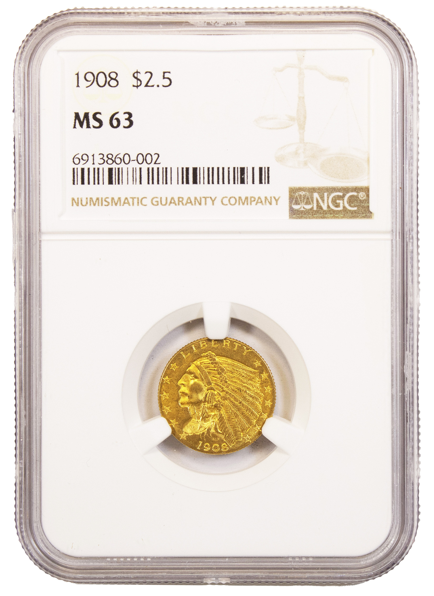 NGC MS-63 1908 Indian $2.50 Gold Indian
