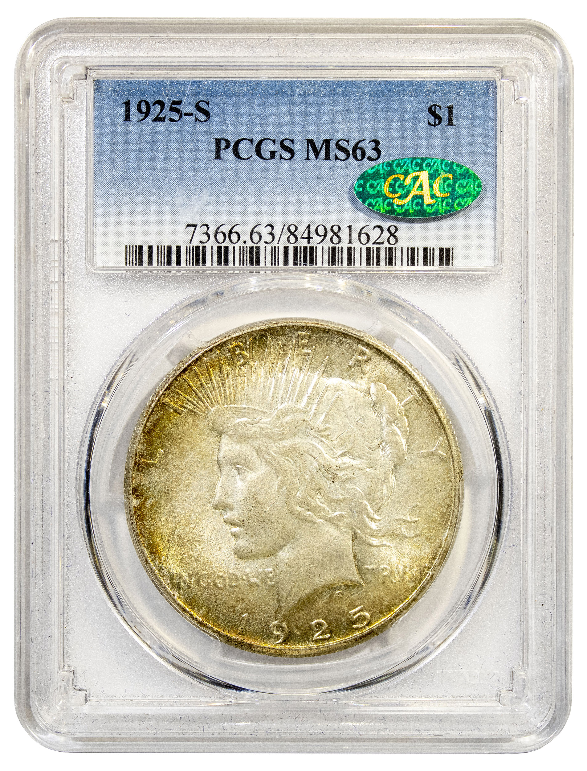 PCGS CAC Toned MS-63 1925-S Peace $1