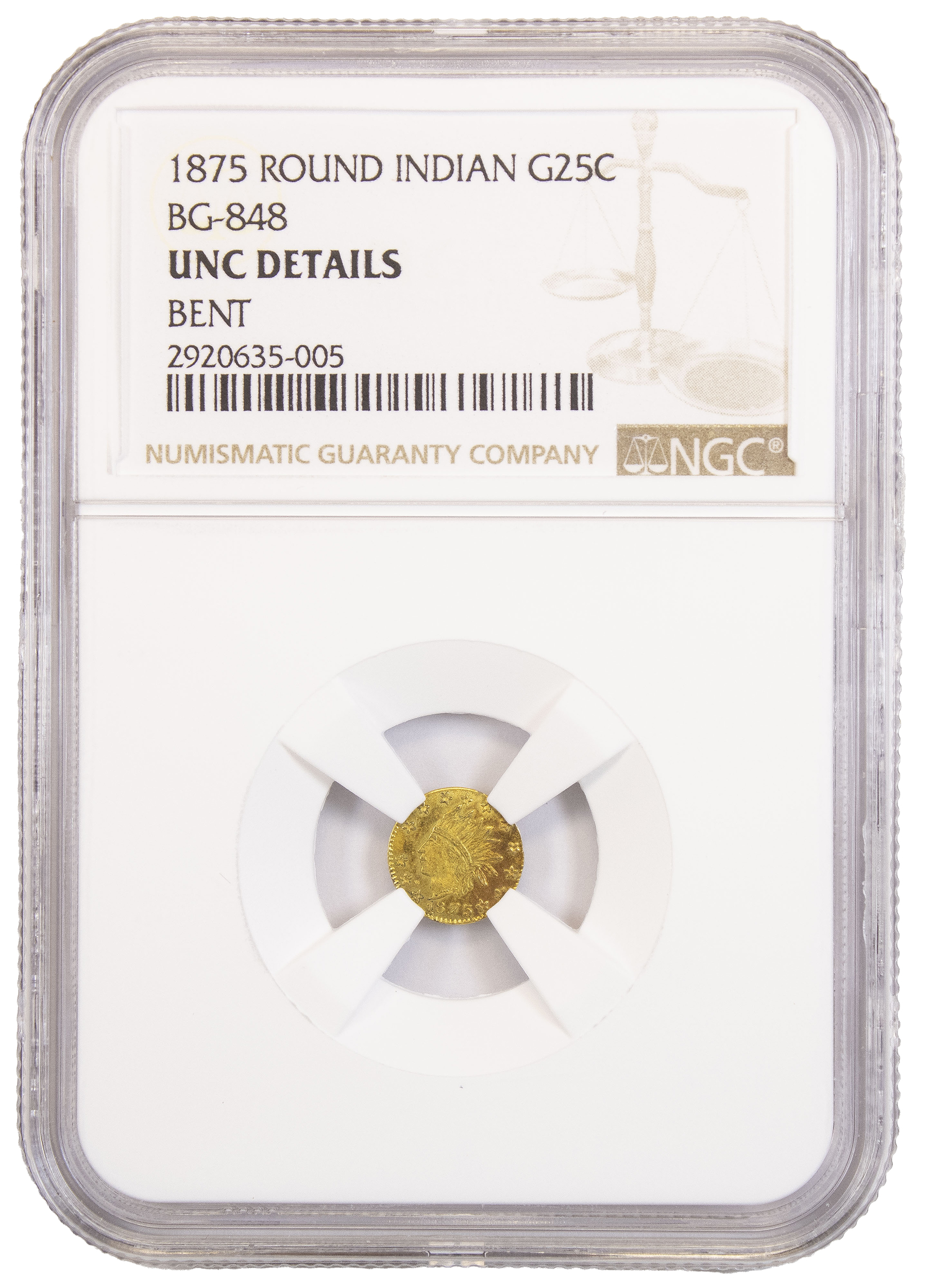 Cal Gold. NGC Unc Details 1875 Round Quarter