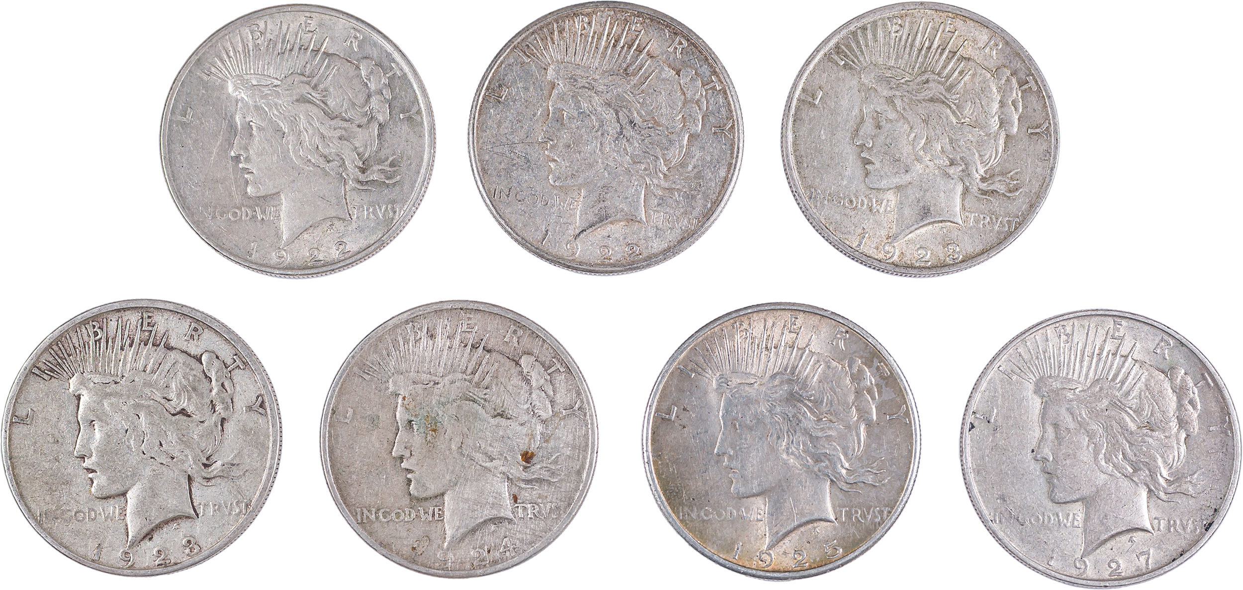 7 Mixed Circulated Peace Dollars