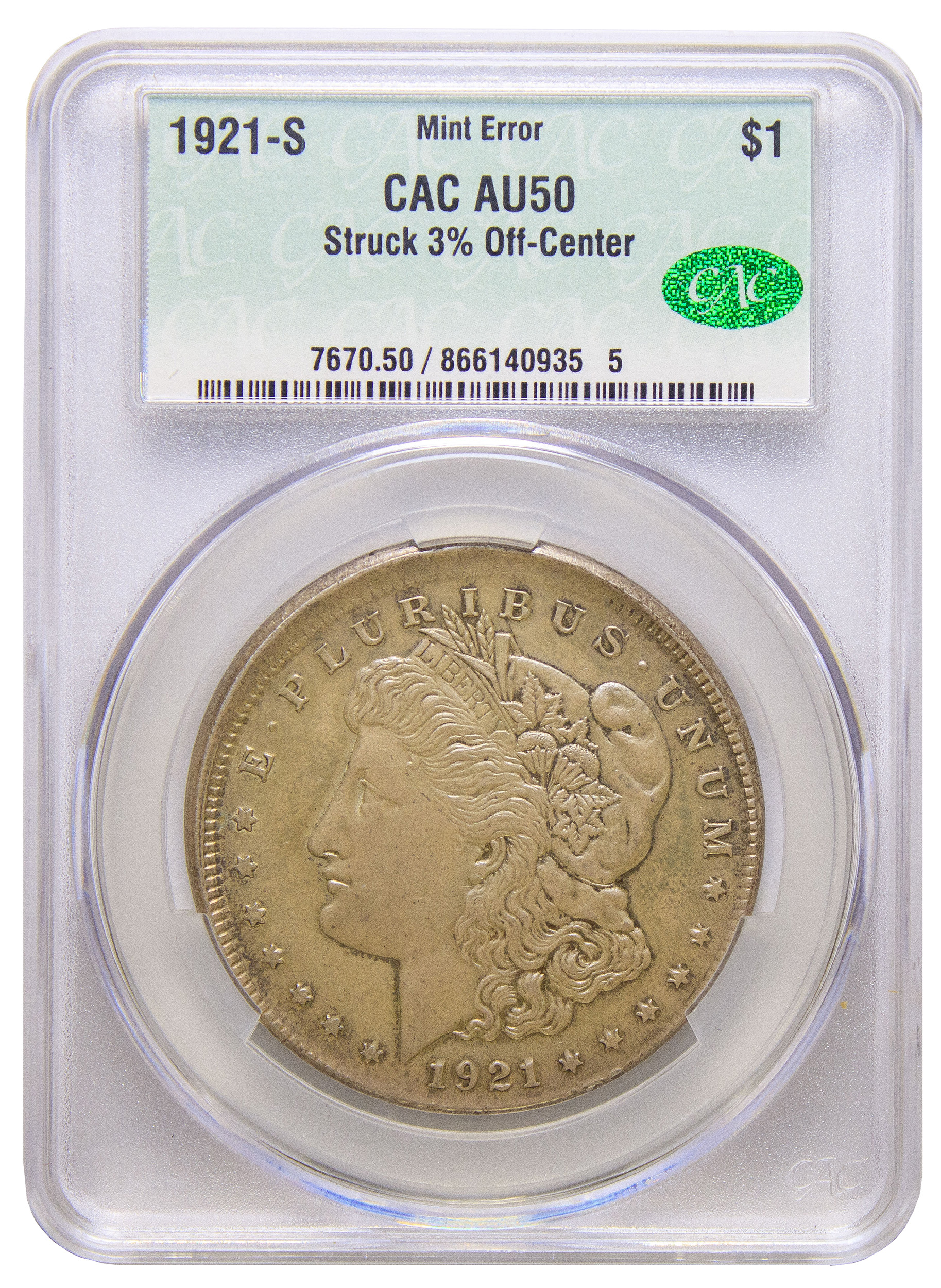 CACG AU-50 Rare Off Center 1921-S Morgan Dollar