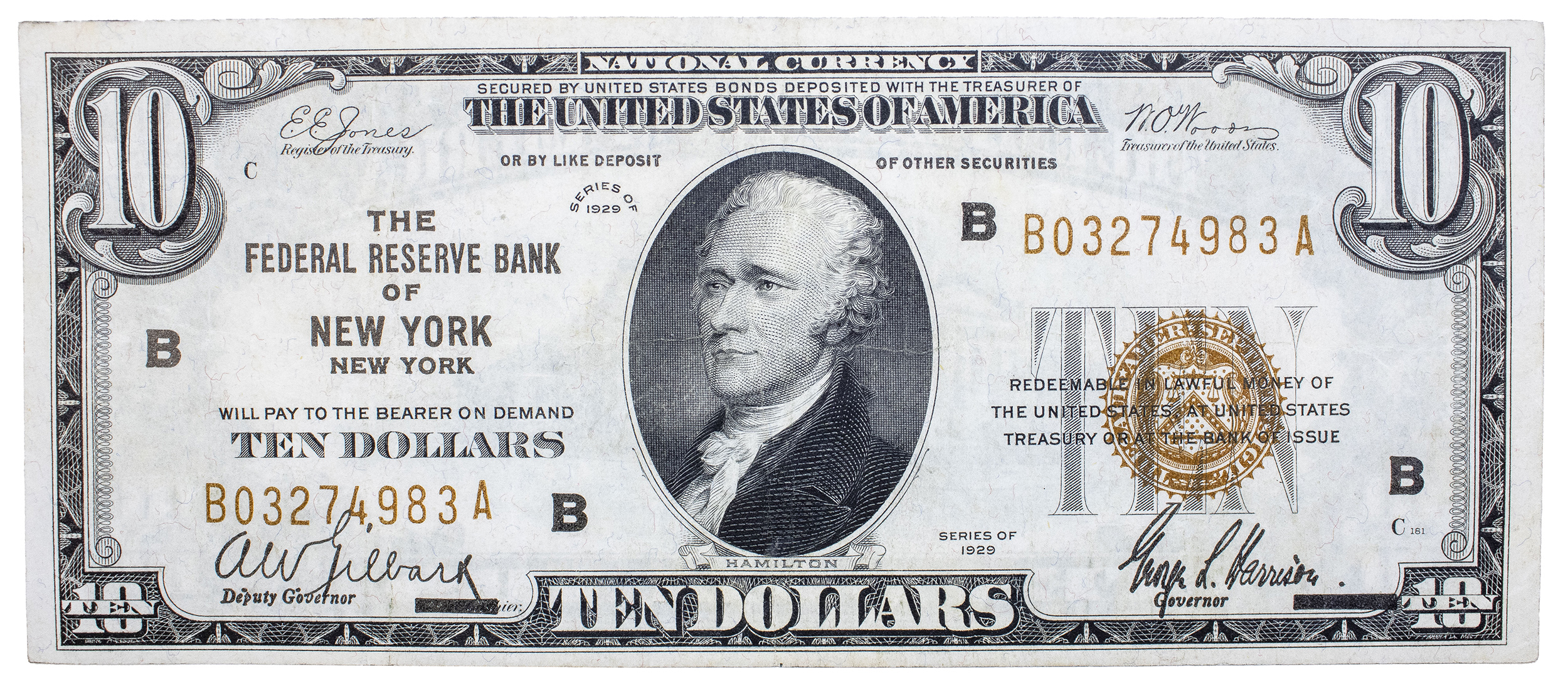 New York. AU or Better 1929 National Currency $10