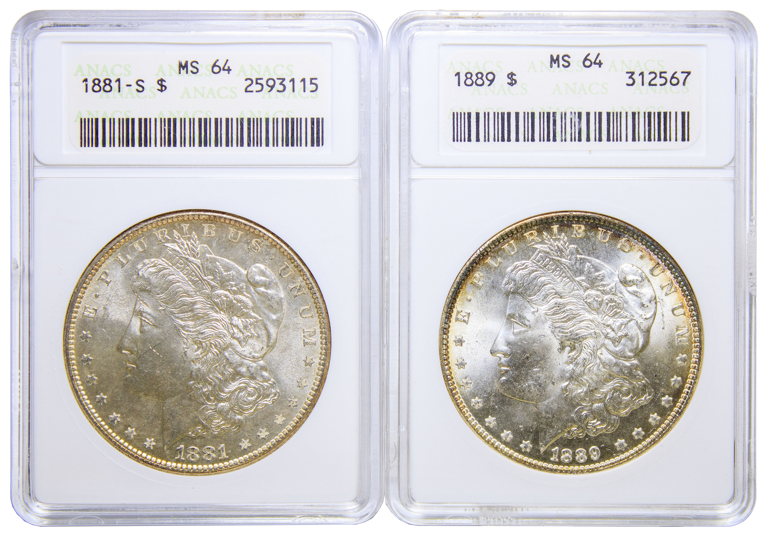 Pair Of Early ANACS Certified MS-64 Morgans