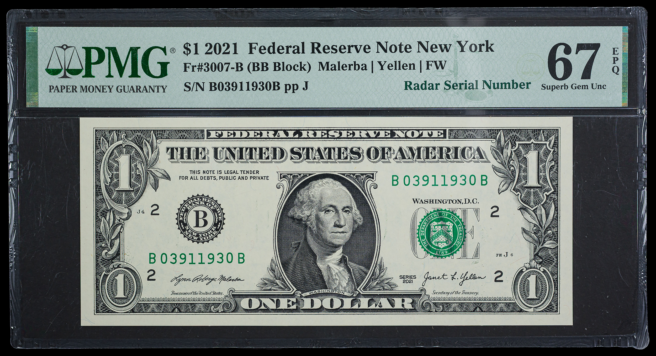 PMG Gem 67 EPQ 2021 $1 Radar Note