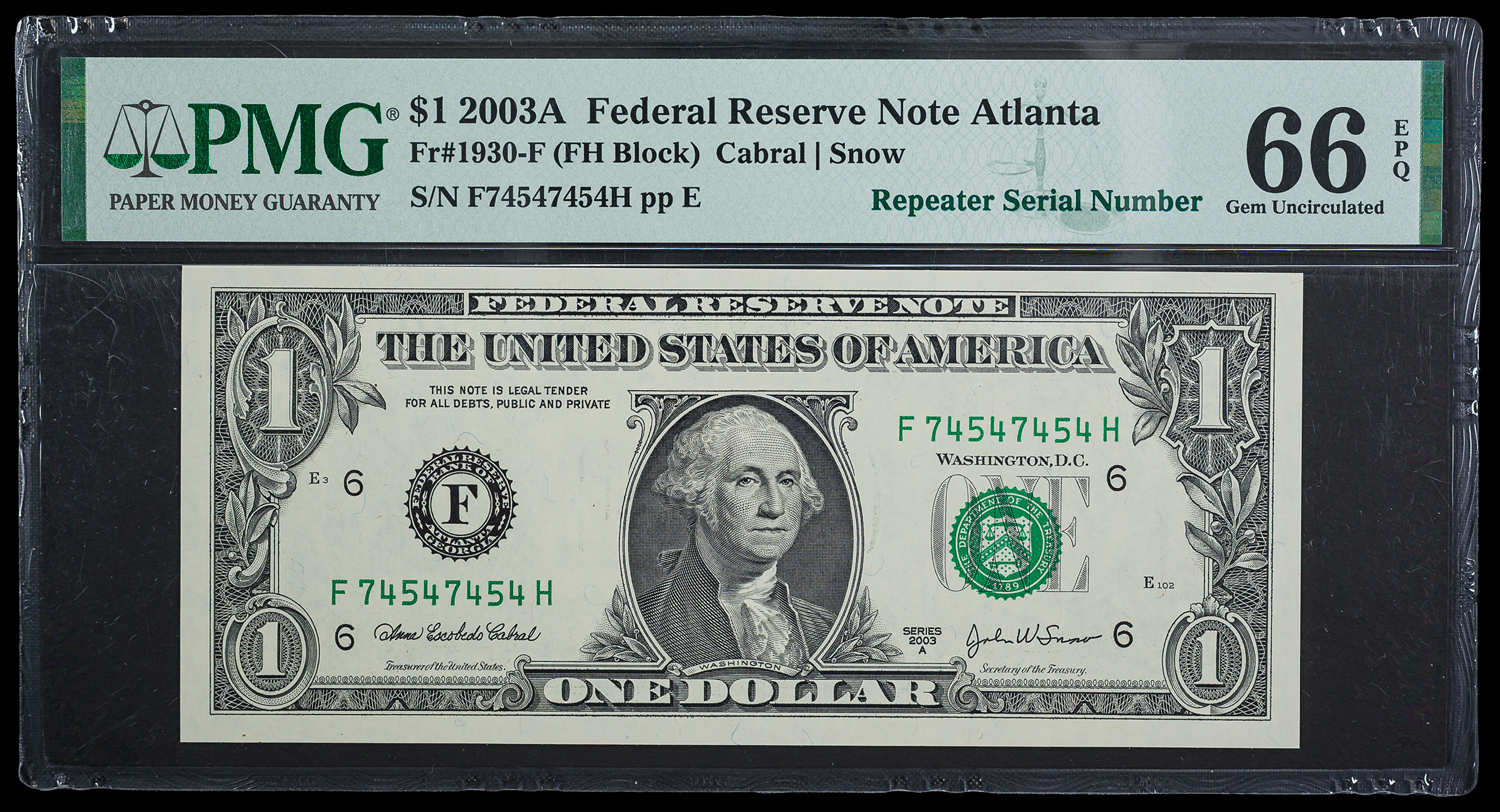 PMG Gem 66 EPQ 2003-A $1 Repeater Note