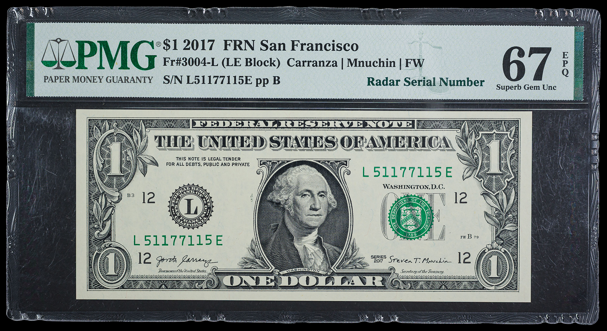 PMG Gem 67 EPQ 2017 $1 Radar Note