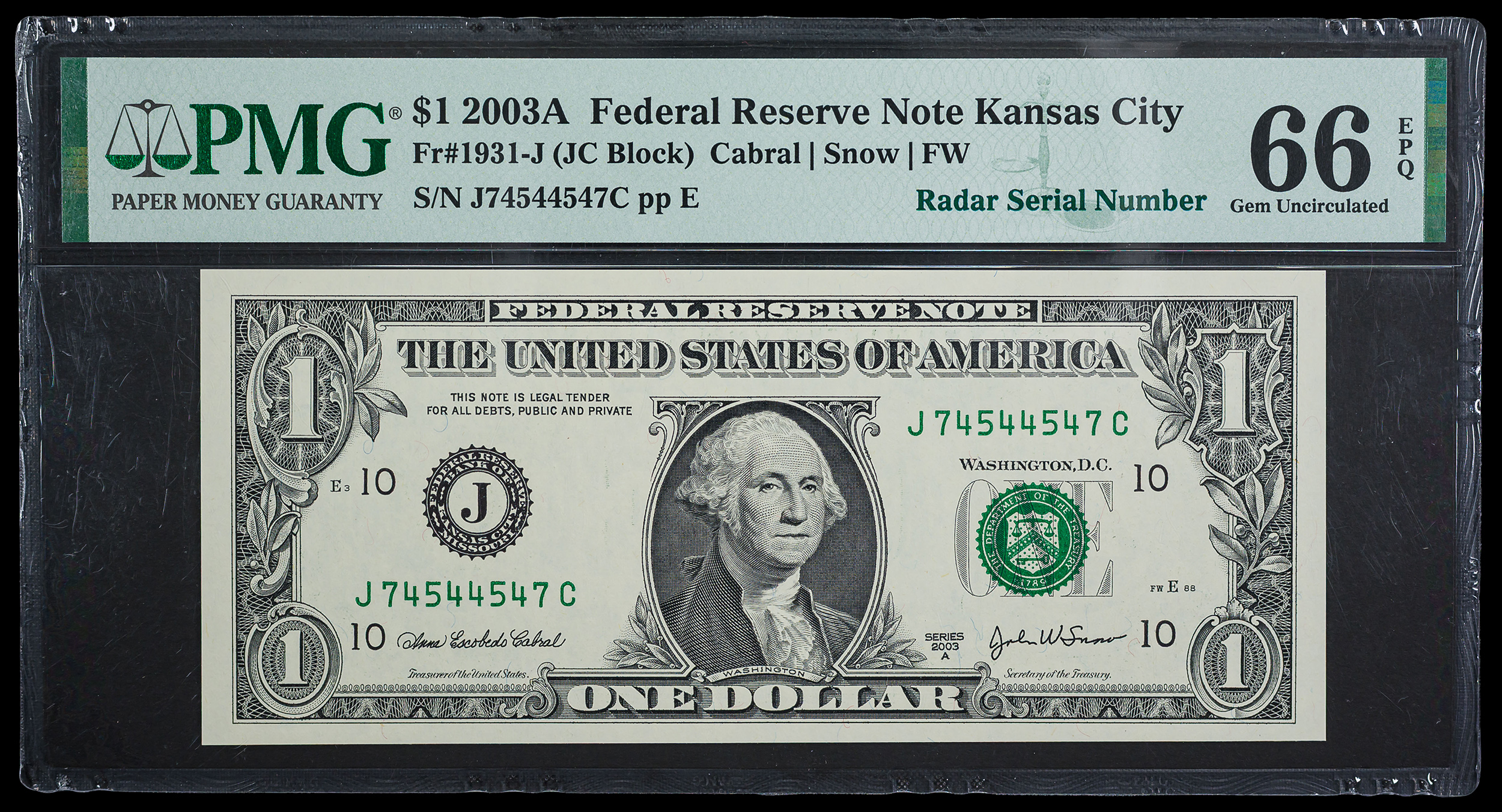 PMG Gem 66 EPQ 2003-A $1 Radar Note