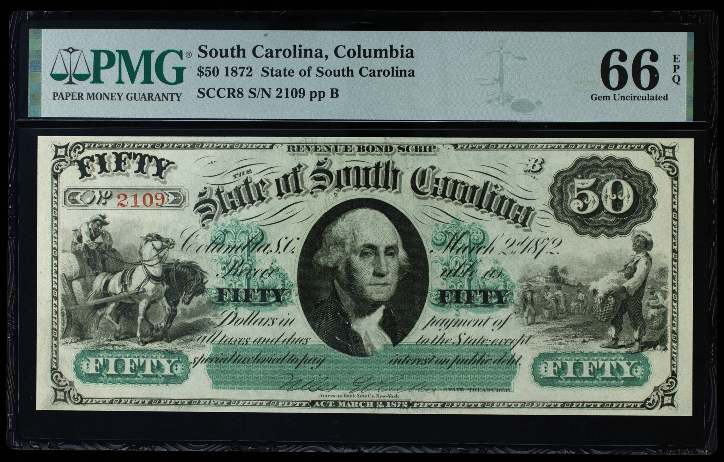 PMG Gem UNC-66 EPQ 1872 South Carolina $50