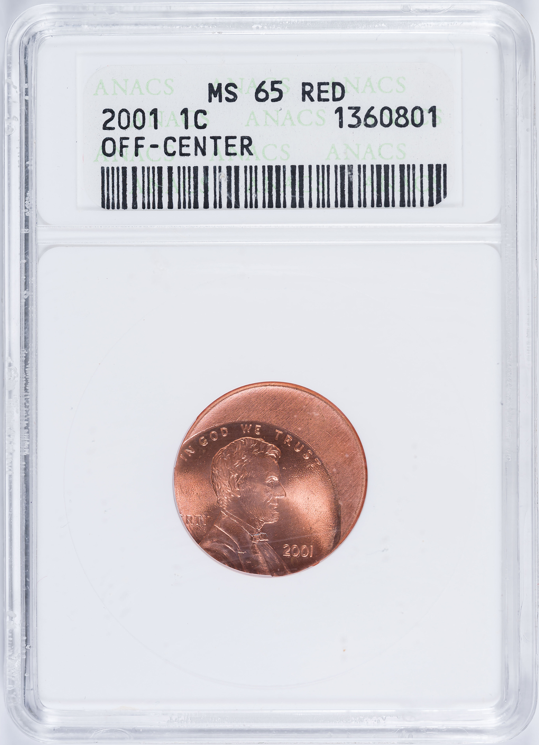 ANACS MS-65 RD 2001 Lincoln Cent Off Center Error