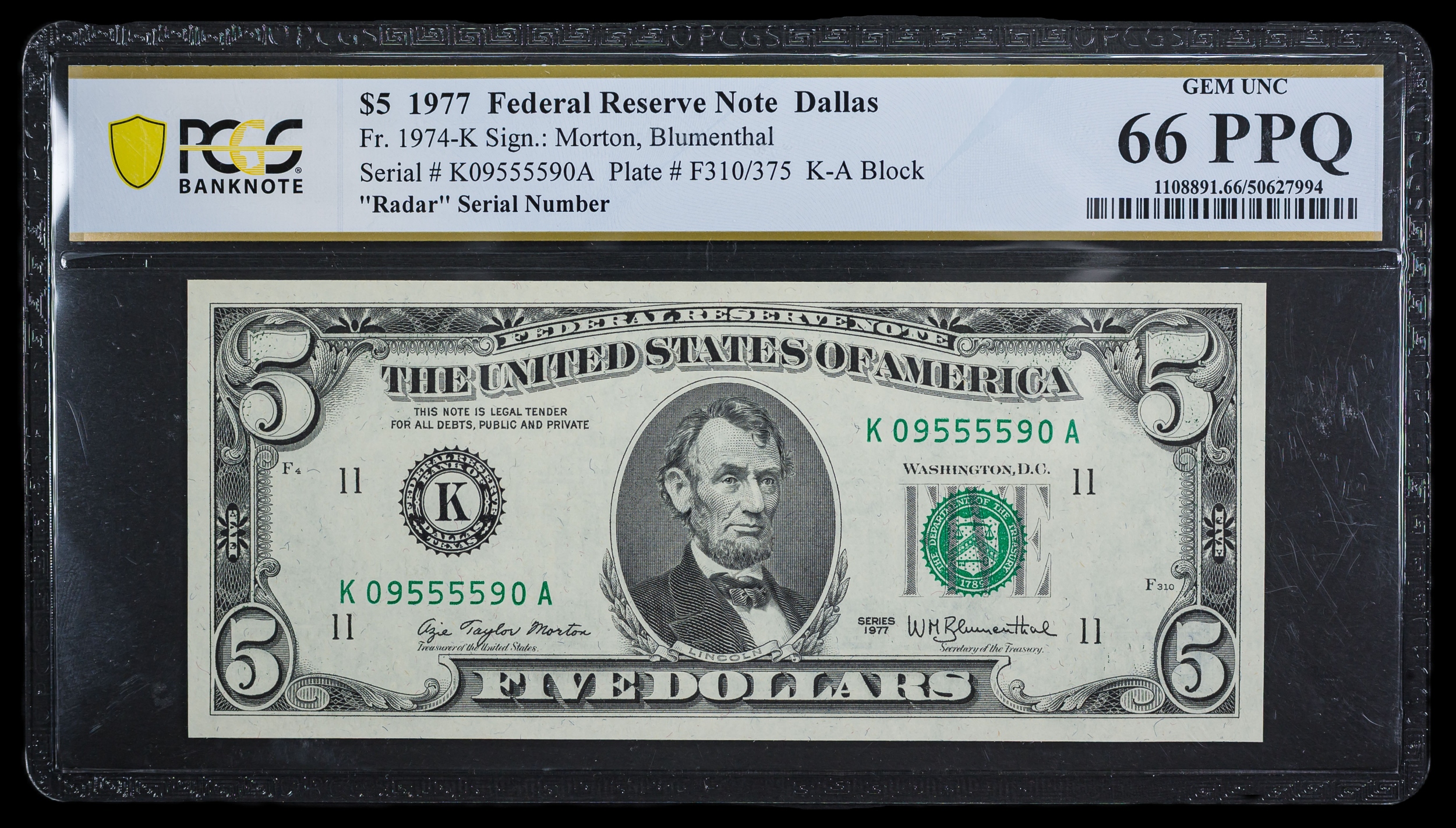 PCGS Gem 66 PPQ 1977 $5 Radar Note