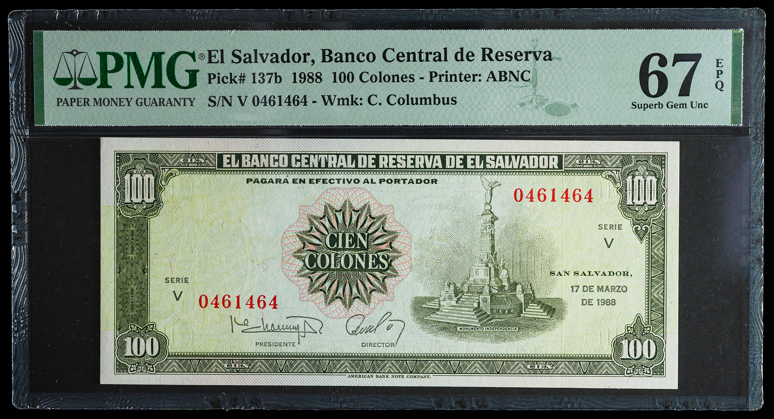 El Salvador. PMG Gem 67 EPQ 1988 100 Colones Note
