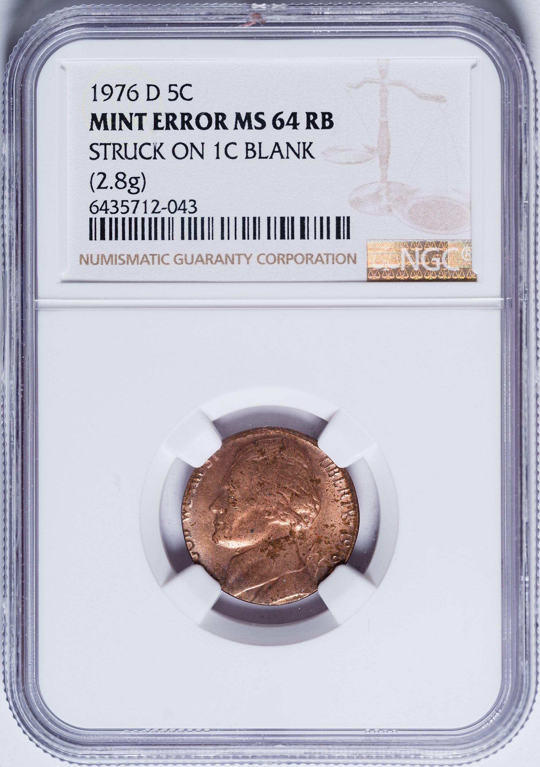 NGC MS-64 RB 1976-D Nickel Struck On A Dime